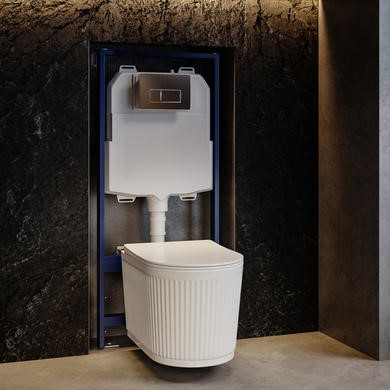 Comes complete with a wall-mounted frame with cistern and a pneumatic matt black flush plate, simplifying installation for a seamless setup.