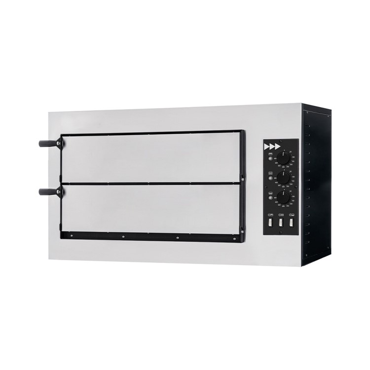 Probably one of the best value for money premium Italian mid size 3T twin deck electric pizza ovens available on the market today, it is perfect for deep pan, thin crust, fresh dough, part baked or frozen pizzas. This oven is also ideal for cooking a variety of other foods such as ciabatta, naan and garlic bread, even lasagne, jacket potatoes, pies and pastries. This is achieved with the innovative integrated heat recirculation system in the cooking chamber. This oven can also take 2 x 600mm x400mm baking trays.