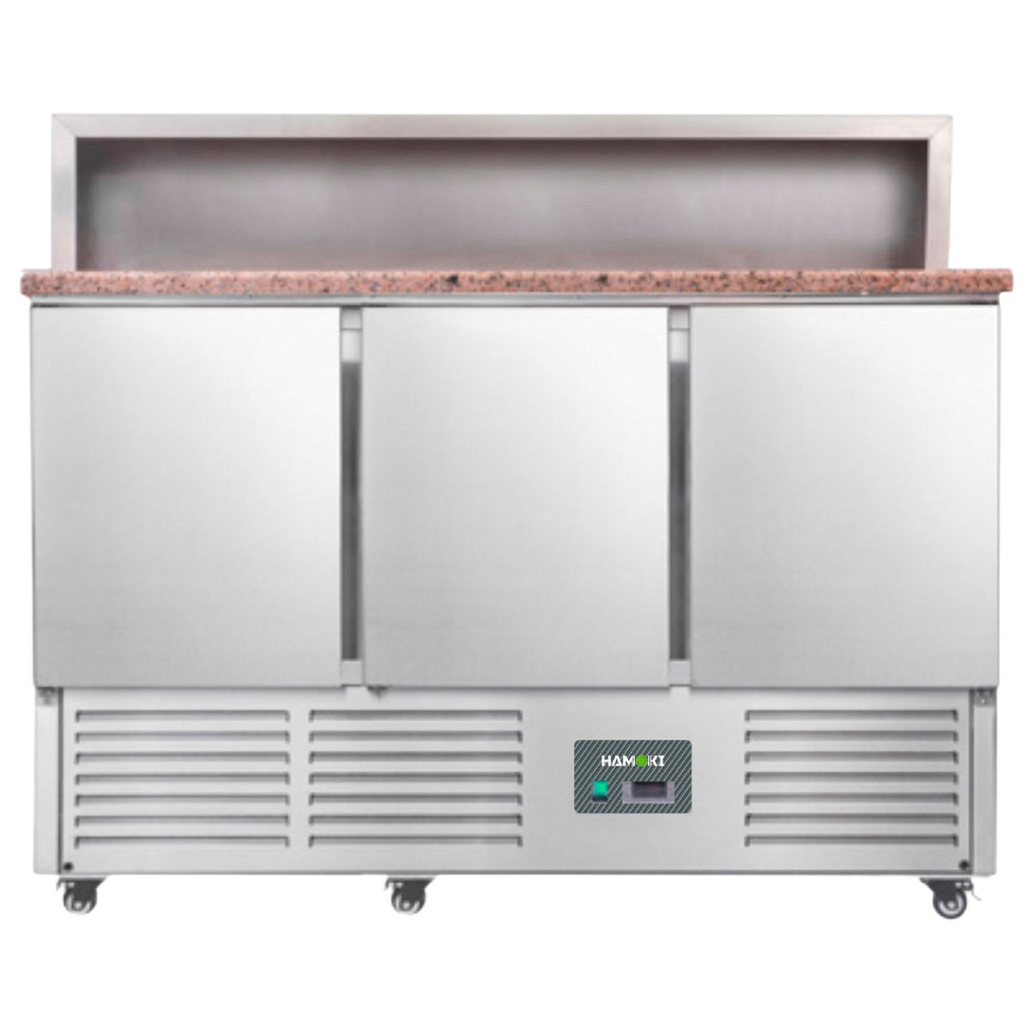 Hamoki PS903 3 Door Refrigerated Pizza Prep - Saladette Counter With Granite Worktop And 8 x GN1/6 Gastronorm Well 346ltr