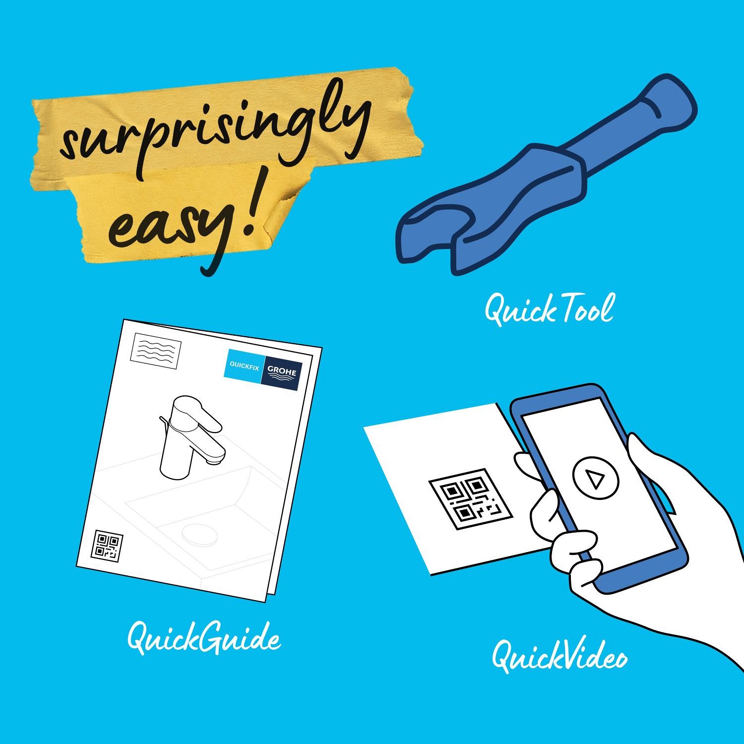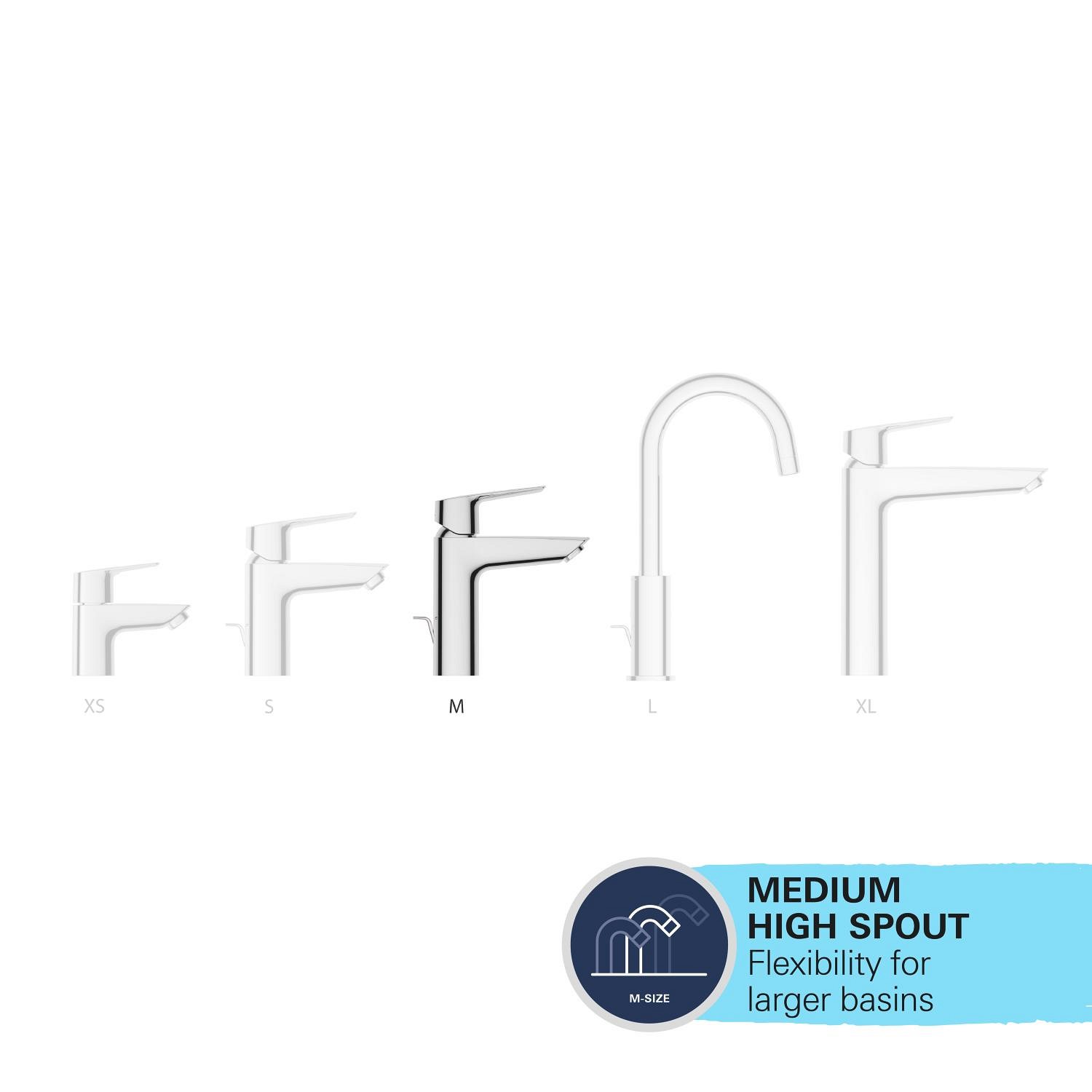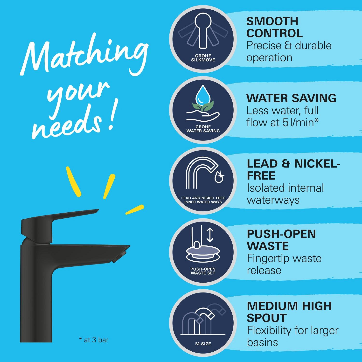 This GROHE start basin mixer in matt black is perfect for upgrading your bathroom. This QuickFix best seller has been improved with speedy installation and its eye-catching finish with its slim and contemporary profile, and increased spout height for greater user comfort. This medium sized single-lever basin tap comes with a slotted push-open waste that can be opened and closed with a light fingertip push. Inside the GROHE SilkMove ceramic cartridge offers durable, precise volume and temperature control via the solid metal lever. The integrated temperature limiter saves energy, while GROHE Water Saving technology reduces your water consumption up to 50 % (5.7 l/min) without compromising on performance. Isolated inner water ways ensure that water is lead- and nickel-free within the tap.