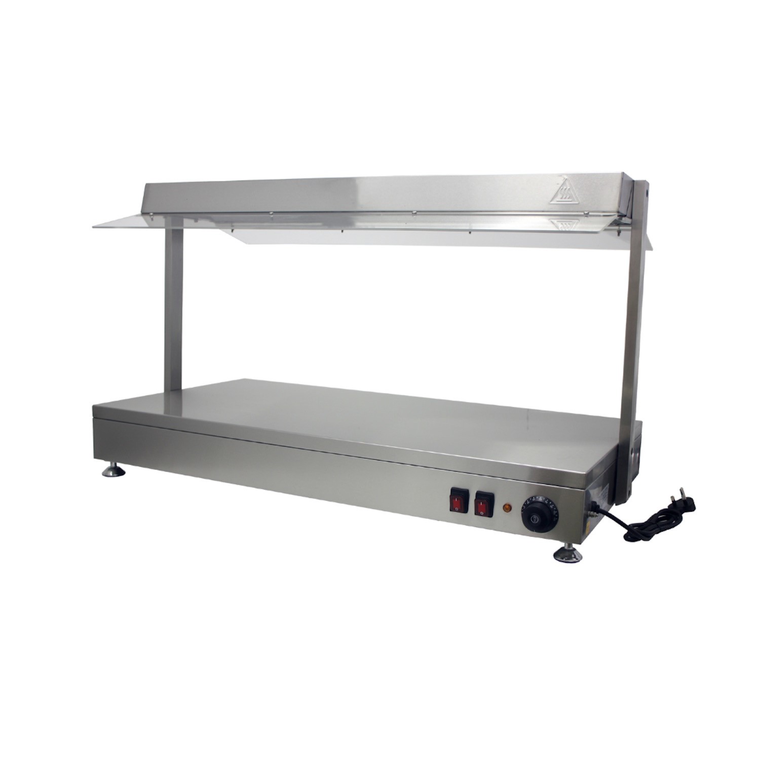The Hamoki SFW-4L is an extra wide triple lamp Heated Display featuring an overhead heated gantry and heated base. It is ideal for keeping food warm and visually appealing in high demand commercial kitchens and restaurant environments. Designed with a dry heated base system and overhead gantry that incorporates Tungsten lamps for additional top down heating and even heat distribution, this unit ensures that dishes remain at the optimal serving temperature without drying out, making it ideal for buffets, serving lines, and front of house displays. It is manufactured in stainless steel for a sleek, modern look that is both durable and stylish whilst seamlessly integrating into any commercial setting to showcase food to customers in an enticing manner. The plexiglass sneeze screen provides additional hygiene protection. This is the 1240mm wide unit that can hold to 3 x 1/1 GN size containers / pans.