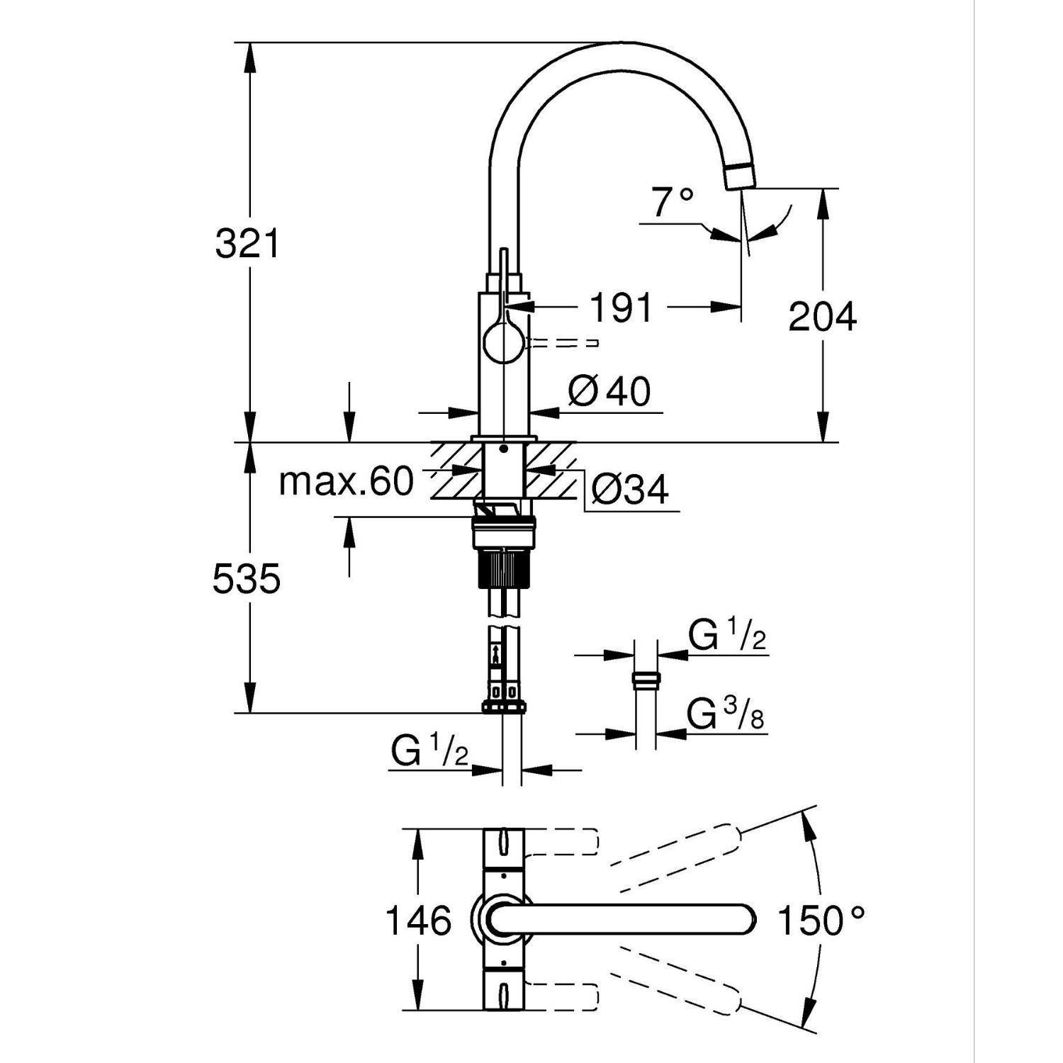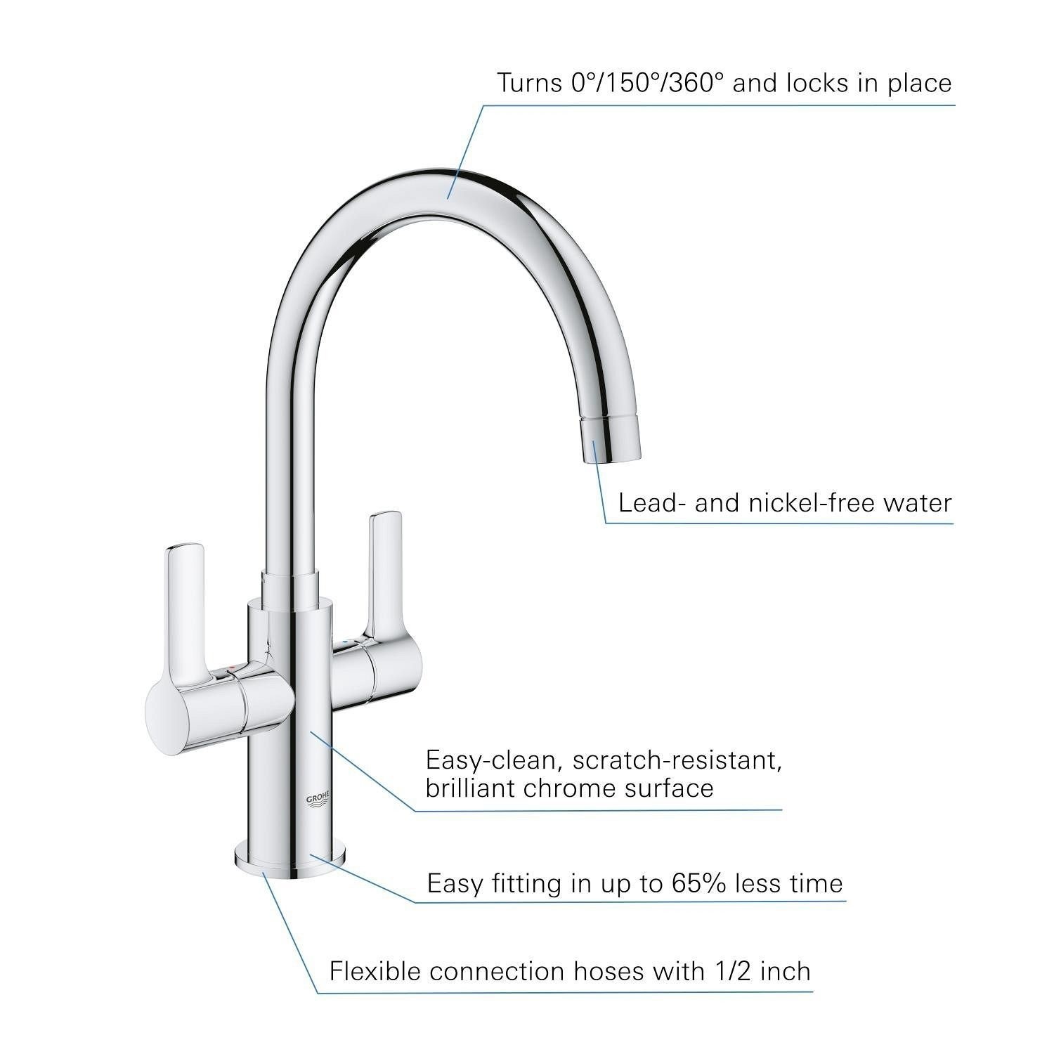 The GROHE Start Two Handle Kitchen Mixer Tap features a timeless C spout design combined with practical functionality, making it a reliable choice for both modern and traditional kitchens. Its elegant profile offers comfortable clearance for everyday tasks such as washing dishes and filling pots.