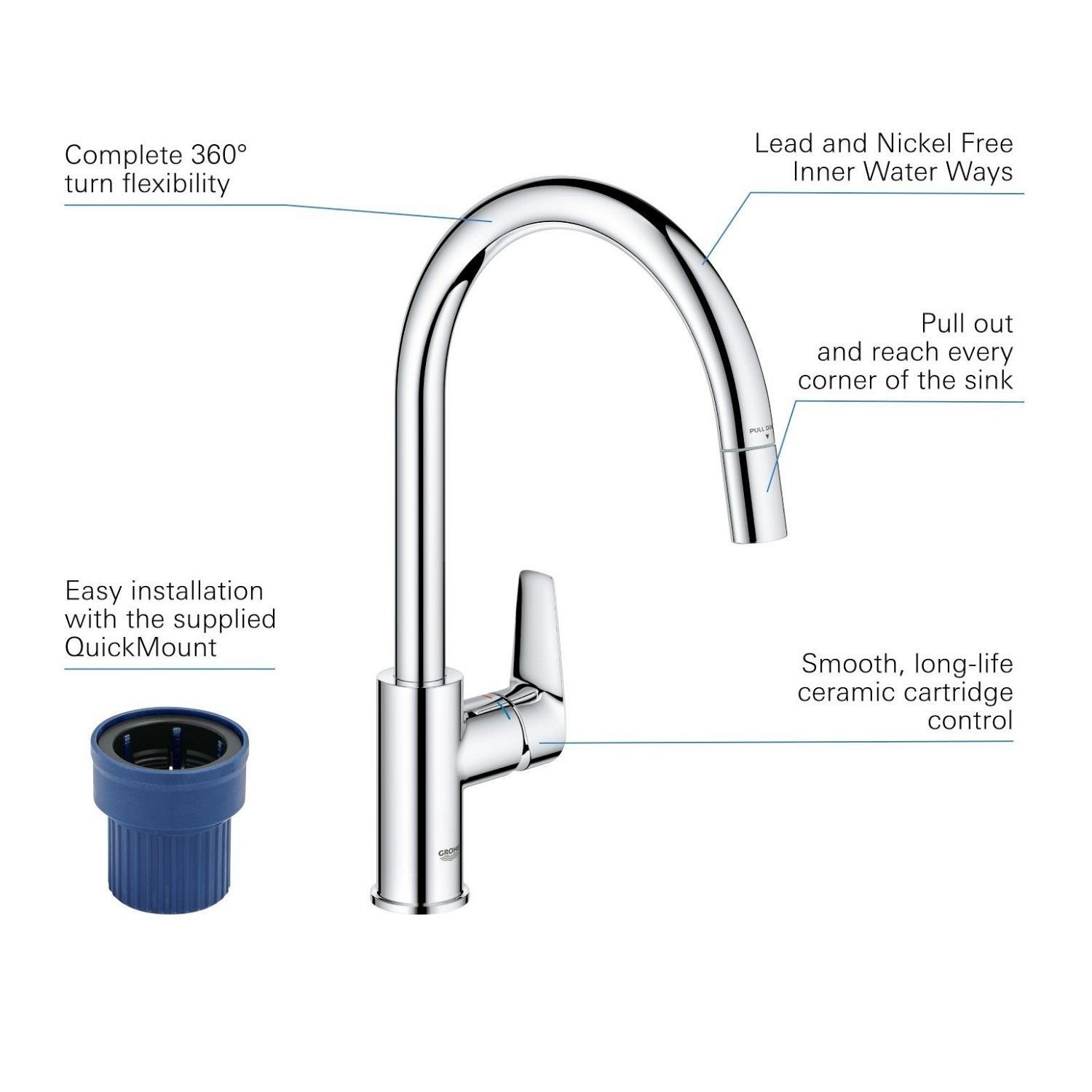 The GROHE Start Edge Kitchen Mixer Tap with C spout and pull-out spray head combines modern styling with practical functionality, making it a versatile choice for contemporary kitchens. Its angular design and generous height provide excellent clearance for everyday tasks, from washing up to food preparation.