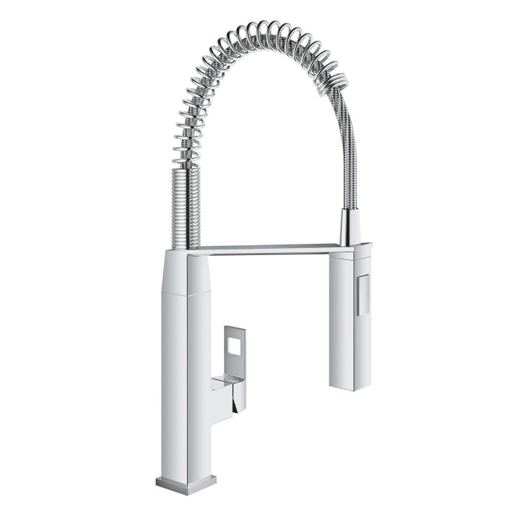 The GROHE Eurocube Kitchen Mixer Tap with medium spout and professional profi spray brings a sleek, modern look and practical functionality to the kitchen. Its angular Eurocube styling and generous spout height provide excellent clearance, making tasks such as filling pots and cleaning the sink effortless.