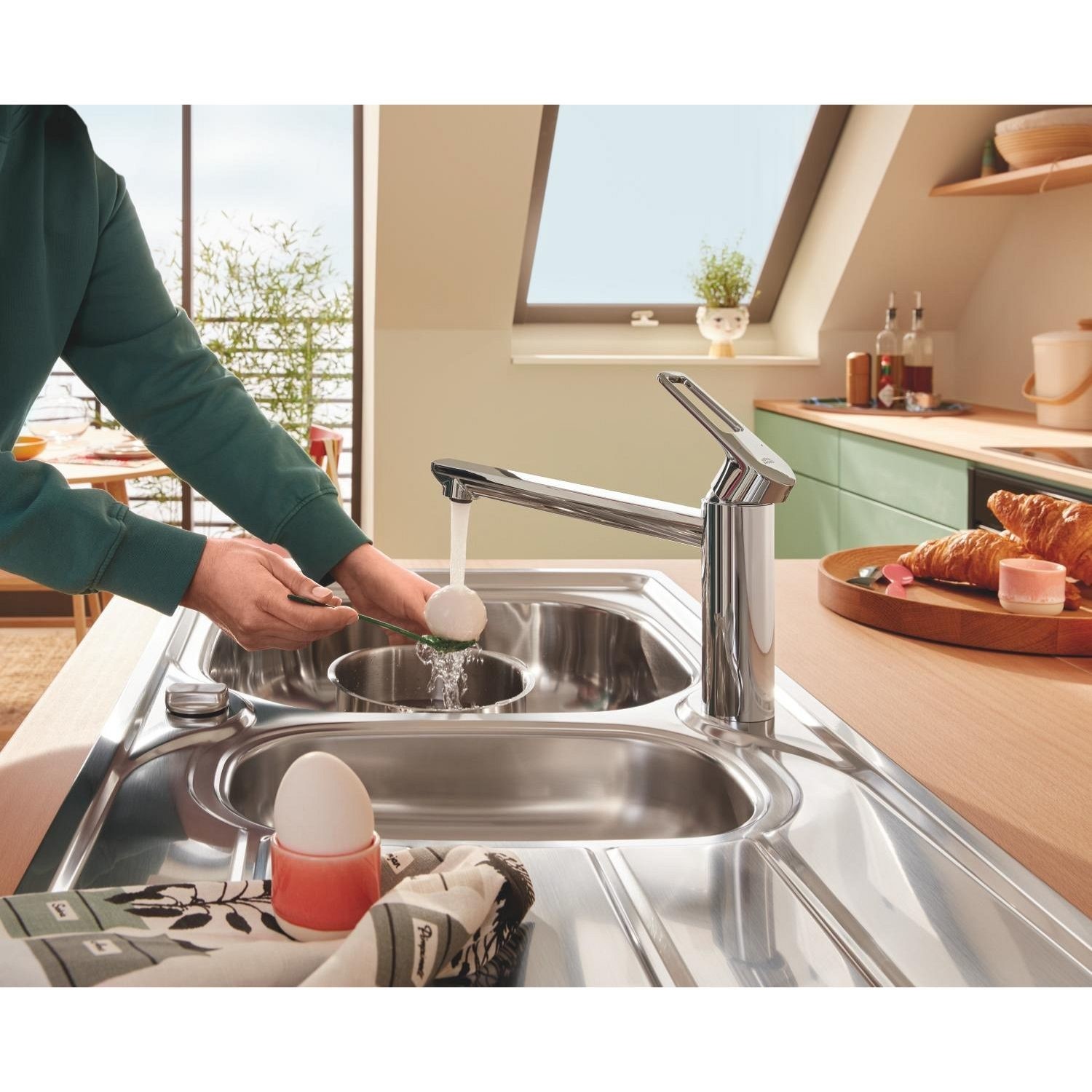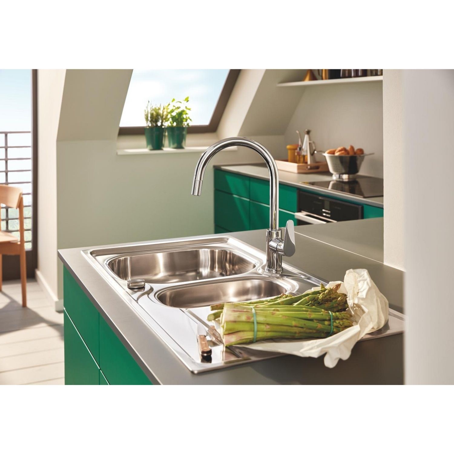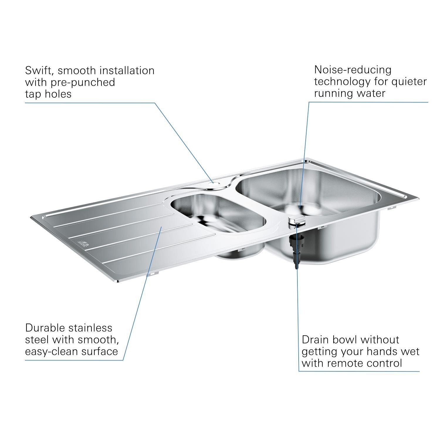 Included with the sink is a complete waste kit, and the two tap holes provide flexibility for different mixer taps. Suitable for base units from 600mm, the K200 combines practical design with trusted GROHE quality.