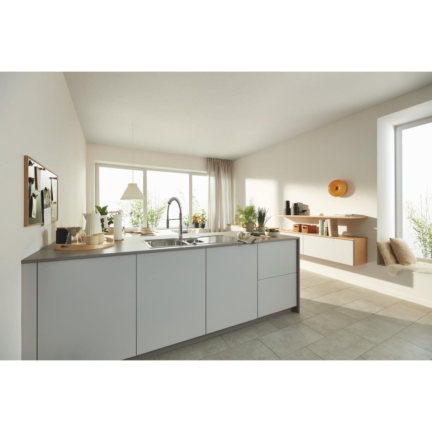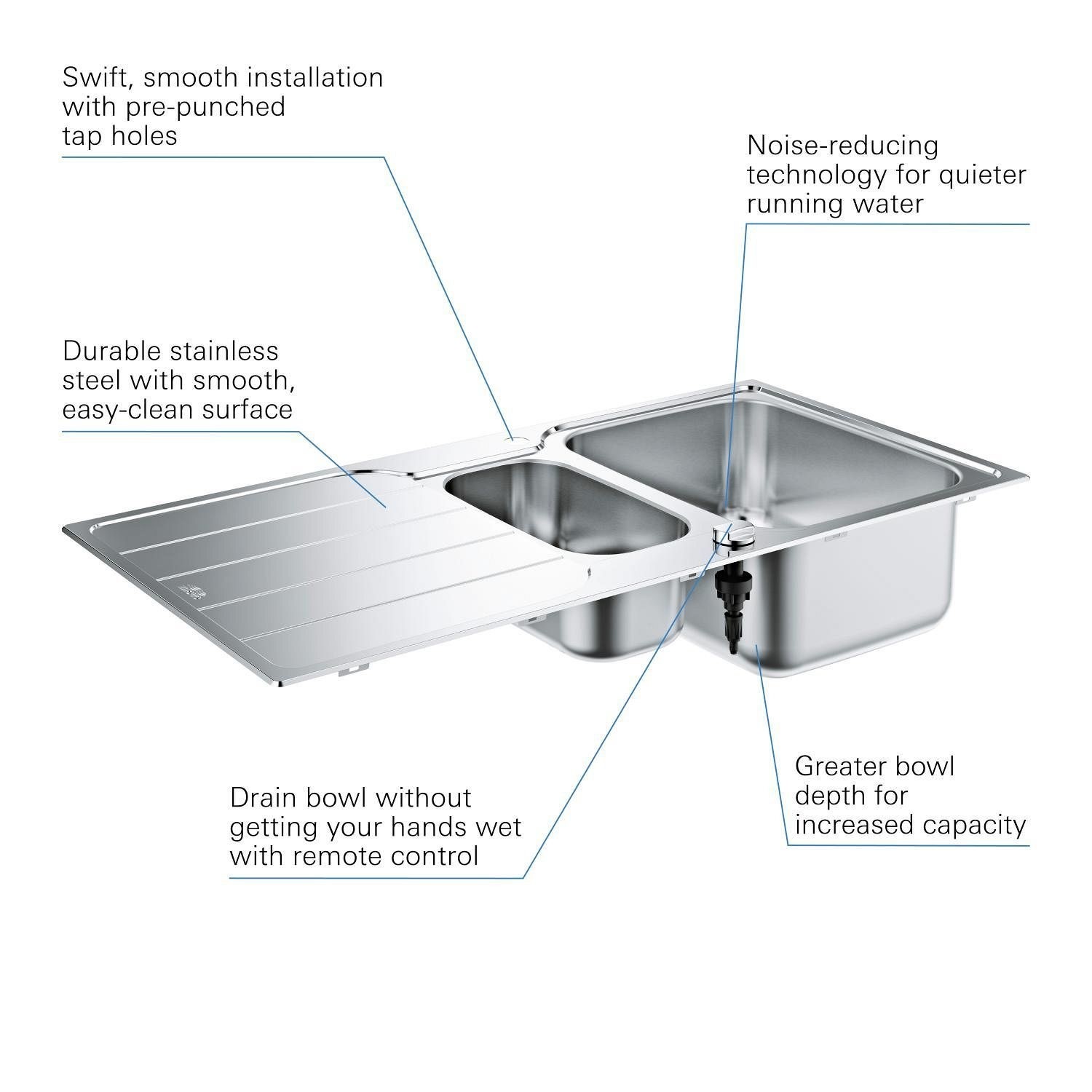 Included with the sink is a complete waste kit, and the two tap holes offer flexibility for various mixer taps. Suitable for base units from 600mm, the K500 sink combines functional design with trusted GROHE quality.