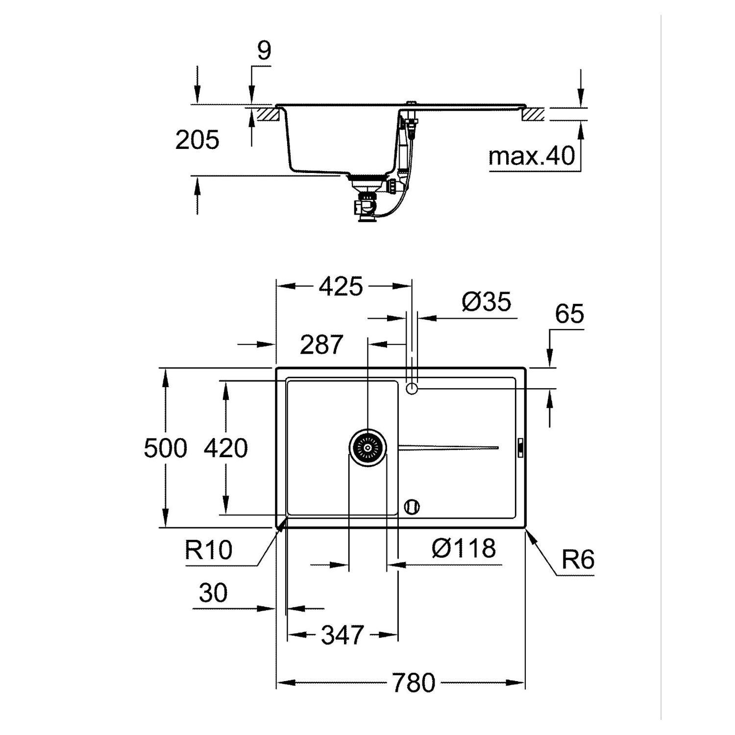 Designed for inset installation, the K400 integrates seamlessly into your worktop. Included with the sink is a complete waste kit, and two tap holes provide flexibility for a variety of mixer taps. Suitable for base units from 500mm, the K400 combines functional design with trusted GROHE quality.