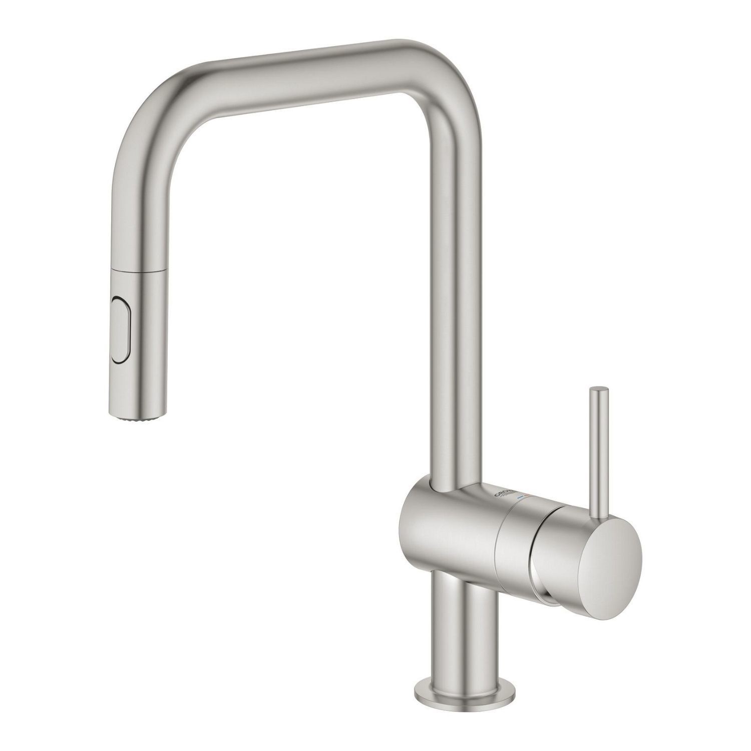The GROHE Minta Kitchen Mixer Tap with U spout and pull-out dual spray head combines contemporary styling with practical functionality. Its high U-shaped spout provides excellent clearance for filling pots, rinsing dishes, and cleaning the sink, while the pull-out dual spray head offers flexibility for a variety of kitchen tasks.