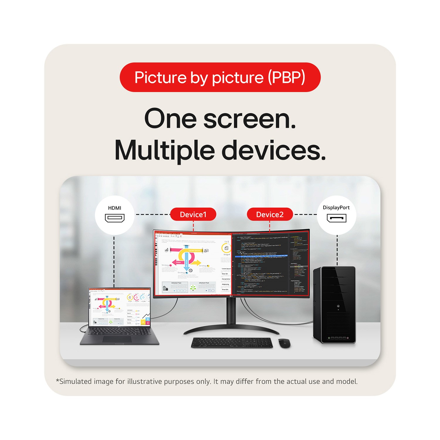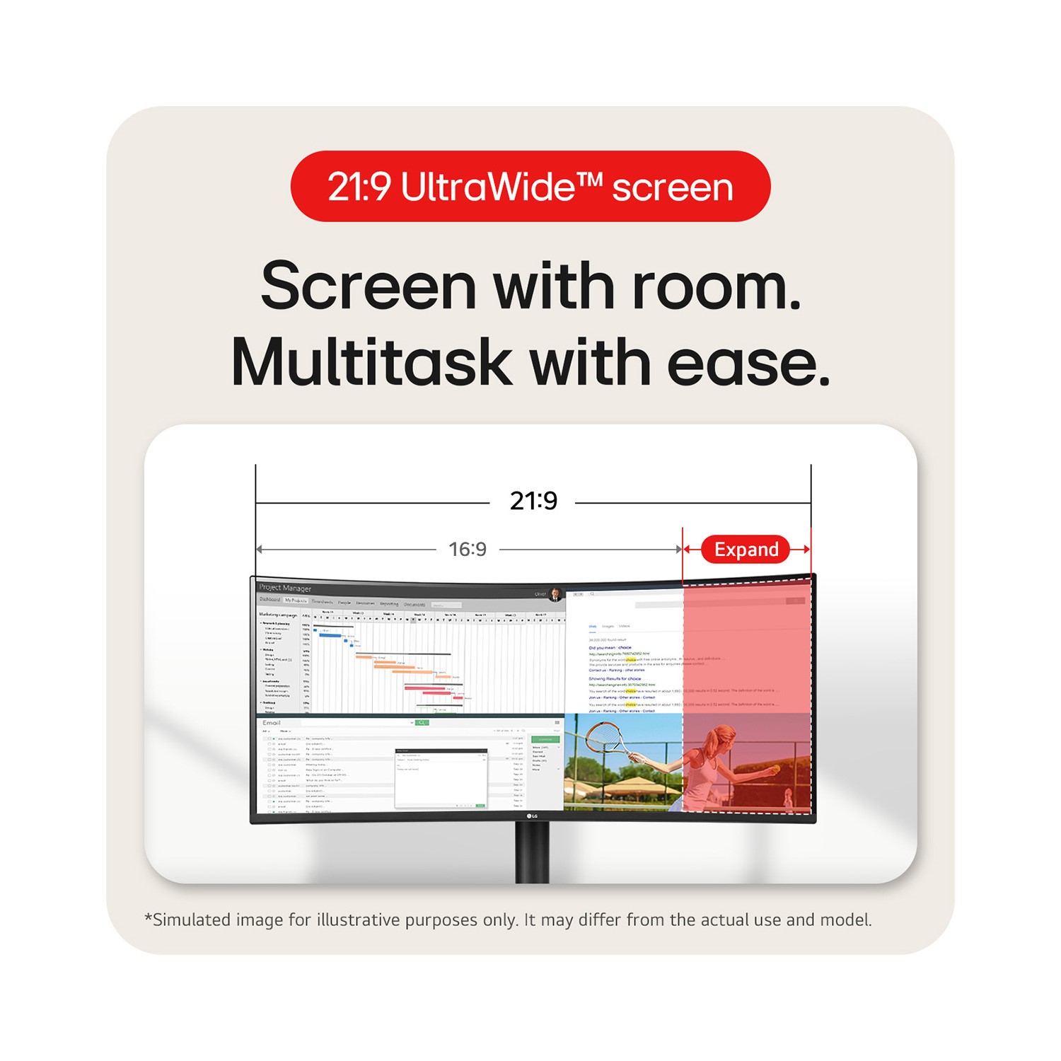 The 21:9 UltraWide WQHD (3440 x 1440) curved monitor is great for work. The widescreen allows you to see everything you're working on, with multiple windows open, all on one screen.
