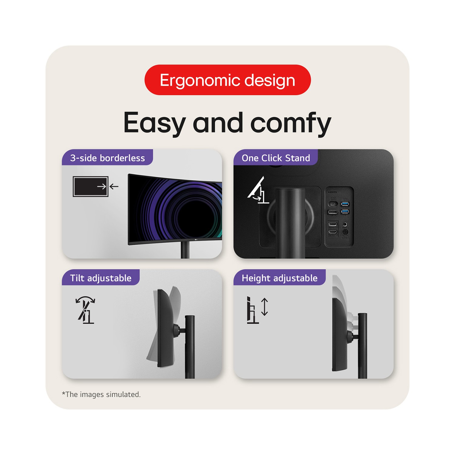 The ergonomic stand makes it easy to flexibly adjust the height and tilt of the screen in the optimal position for you.