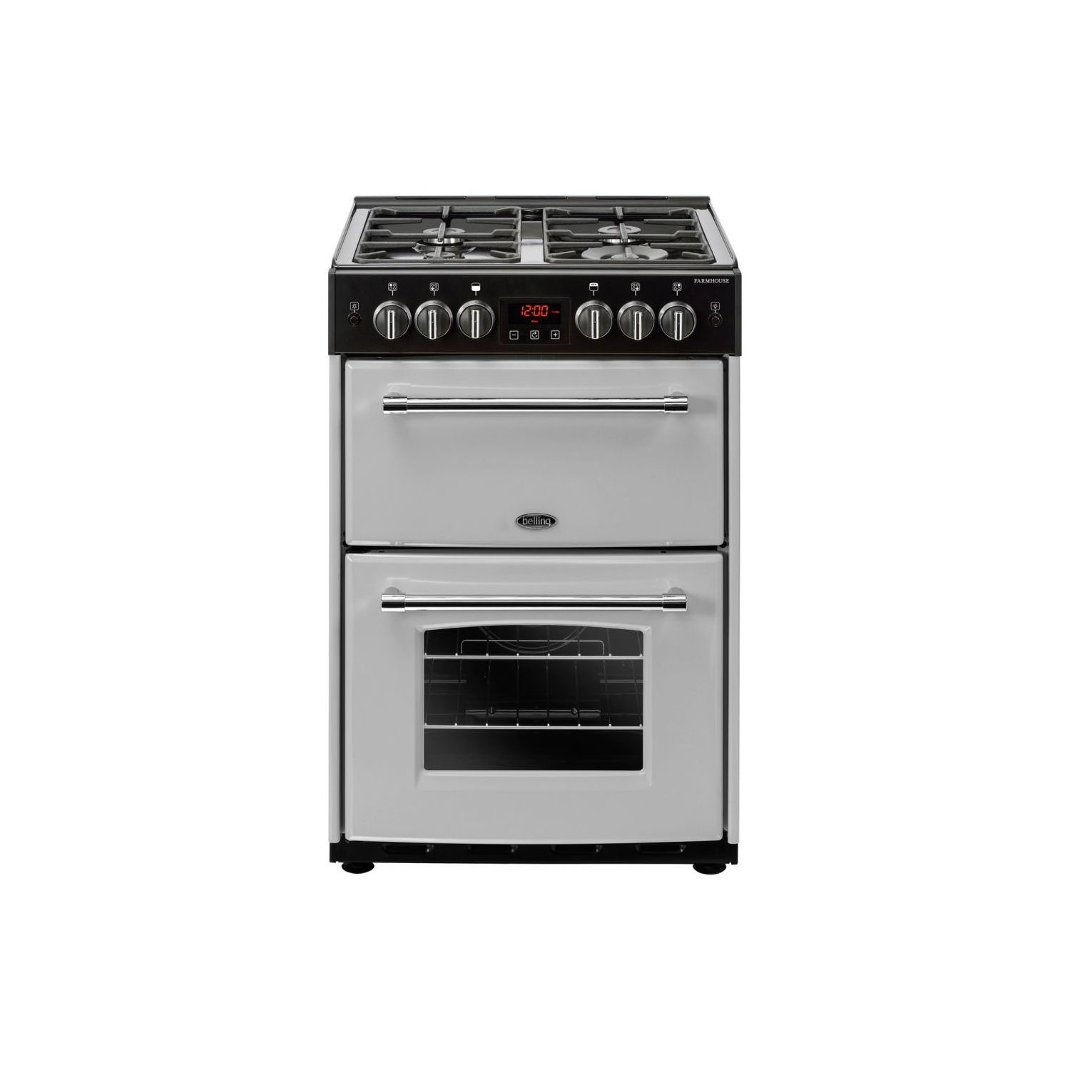 60cm gas double oven offers 4 gas burners, cast iron pan supports, large touch control LED clock/programmable timer, rotary controls & easy clean enamel. A/A energy rating.
