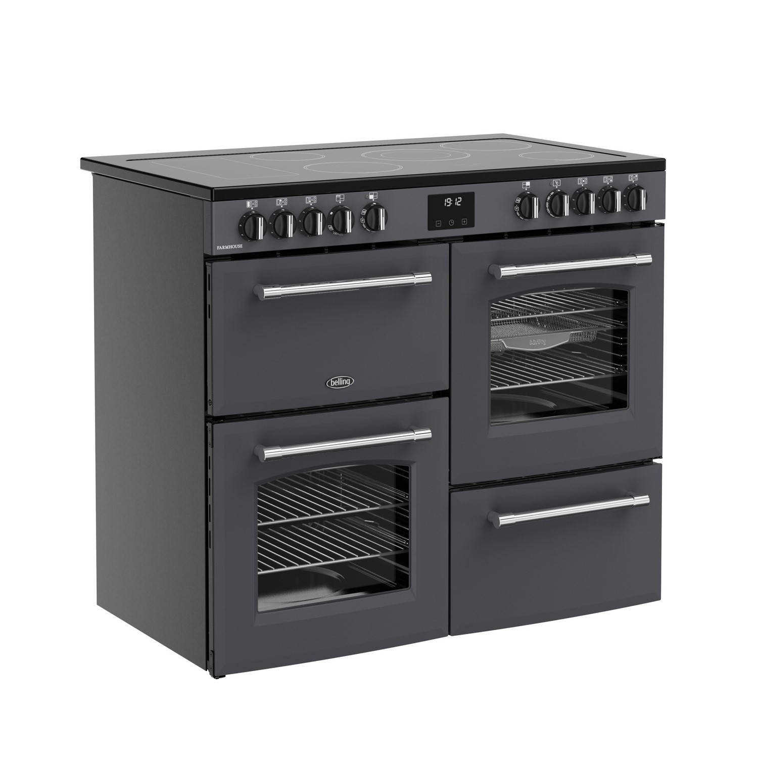 Belling range cookers have been at the heart of UK homes for more than a century, and they’ll be there for you for many years to come. This all-electric model features electric ovens with a 5-zone ceramic hob plus a warming zone and at 100cm wide, this mid-size range cooker will fit right into kitchens of all sizes. Underneath its sleek, contemporary finish, there’s 157 litres of cooking capacity and a host of features designed to make cooking simple. You can choose between two electric ovens: a conventional electric second oven, and the fanned main electric oven with a variety of different functions. This includes the AirFry function and tray, which puts all the time-saving benefits of this appliance back into your oven (freeing up space on your countertop.)