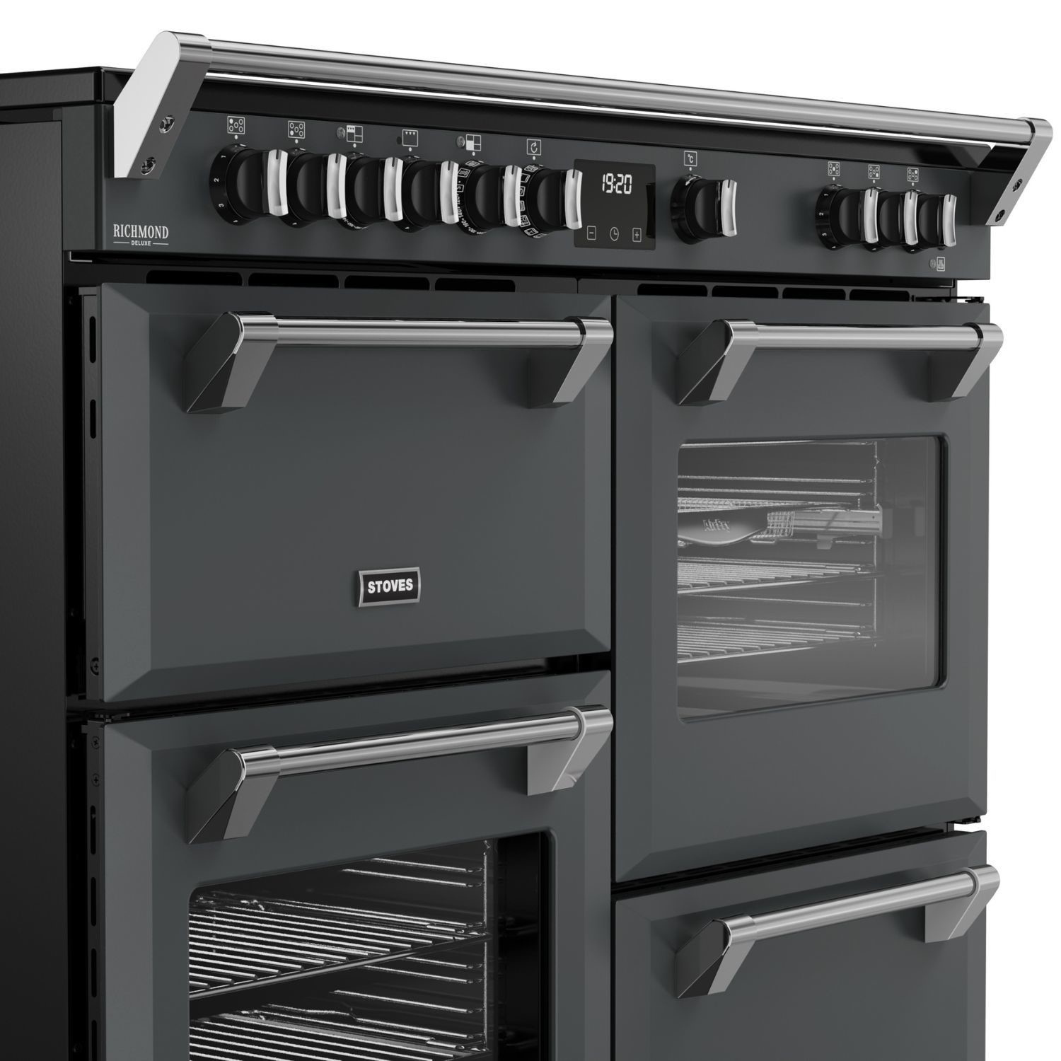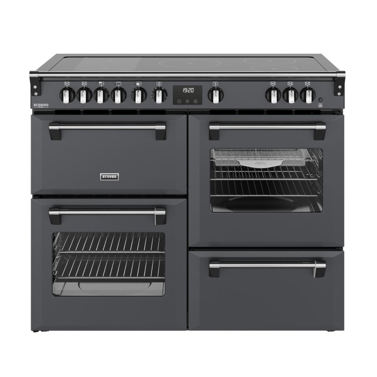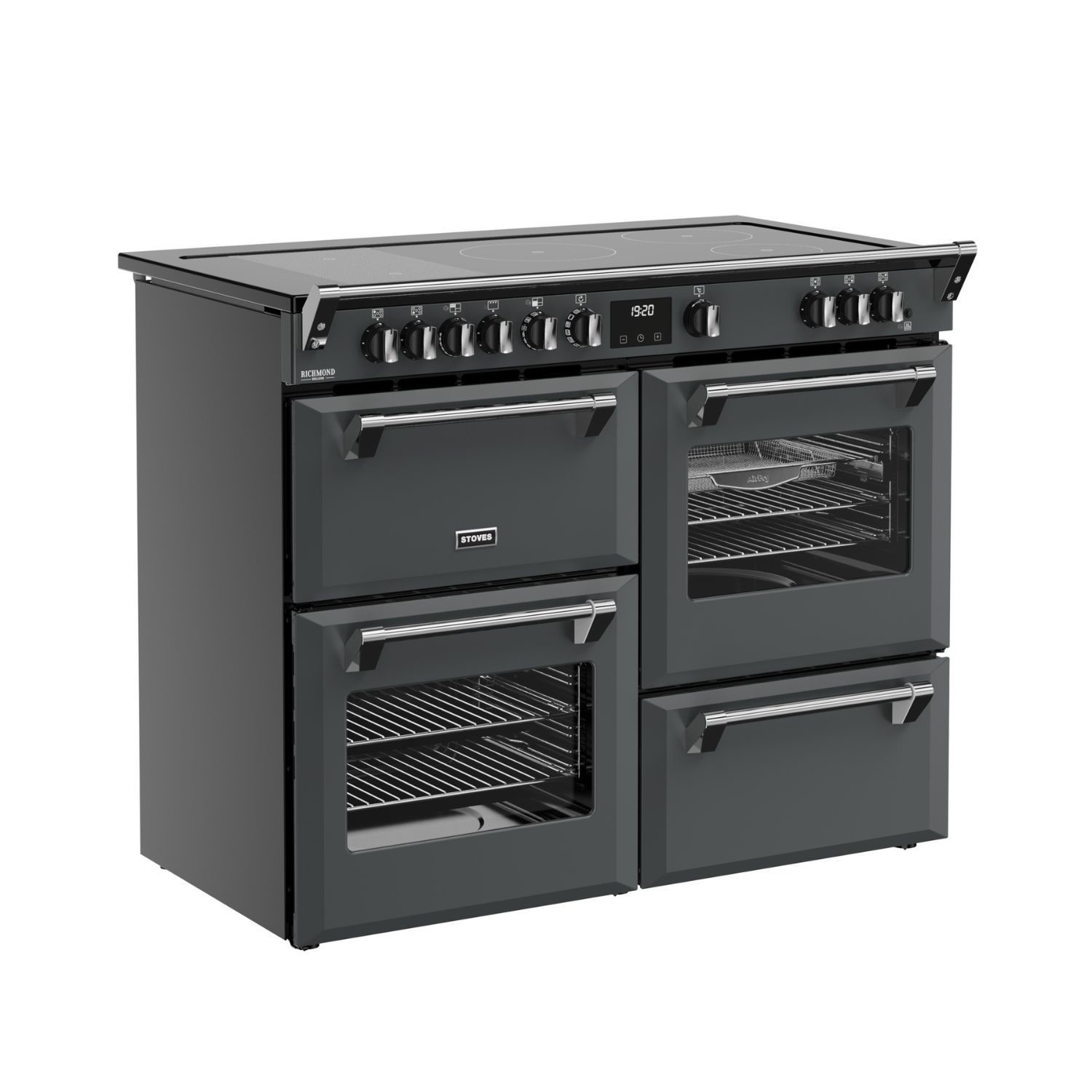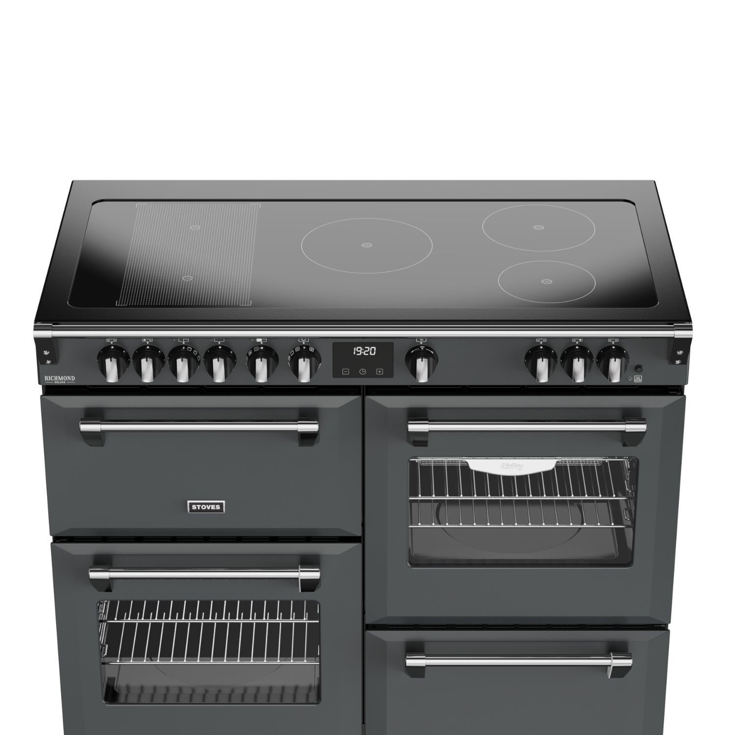 Culinary confidence is served with Stoves Deluxe – a cutting-edge collection of electric range cookers designed to help you master every meal. The unique QuadOven™ is a Stoves exclusive that gives you 196 litres of cooking capacity across four ovens – including a dedicated Slow Cook Oven, conventional oven and Maxi-Grill™, Equiflow™ fanned oven, and multifunctional main oven. It features 13 different settings such as rapid pre-heat and the AirFry function with specially designed tray – giving you that unbeatable crispness with little to no oil. The expansive hob features advanced induction technology, which heats the pan instead of the hob surface to make cooking safer, faster and more energy efficient. There are five rotary-controlled induction zones, giving you space to fry, boil and simmer - or you can bridge zones together to boost surface area for the biggest pans. Beyond the cooking capabilities, there’s a host of other features designed to help you get the best results, including the TrueTemp™ digital thermostat, Maxi-Clock™ programmer and SteamCleanse cleaning assistant. Combining luxury style with ground-breaking innovation, this modern take on a traditional range cooker gives home cooks what they really want - consistently delicious results.