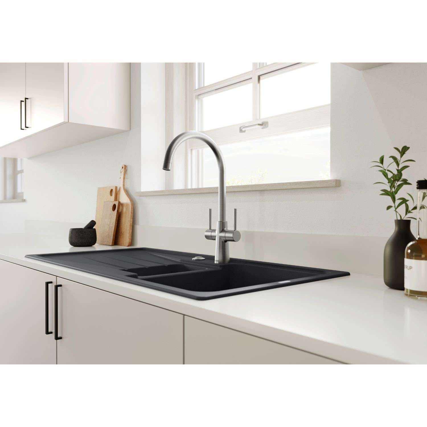 The BLANCO CLASSIC MAX tap brings a perfect balance of style and practicality to your kitchen. Its high-arch spout offers plenty of space for filling large pots and vases, while the smooth swivel action expands your working radius for added flexibility. With twin levers and a robust brass build finished in elegant PVD Steel, this tap is designed for both durability and timeless appeal—ideal for low-pressure water systems.