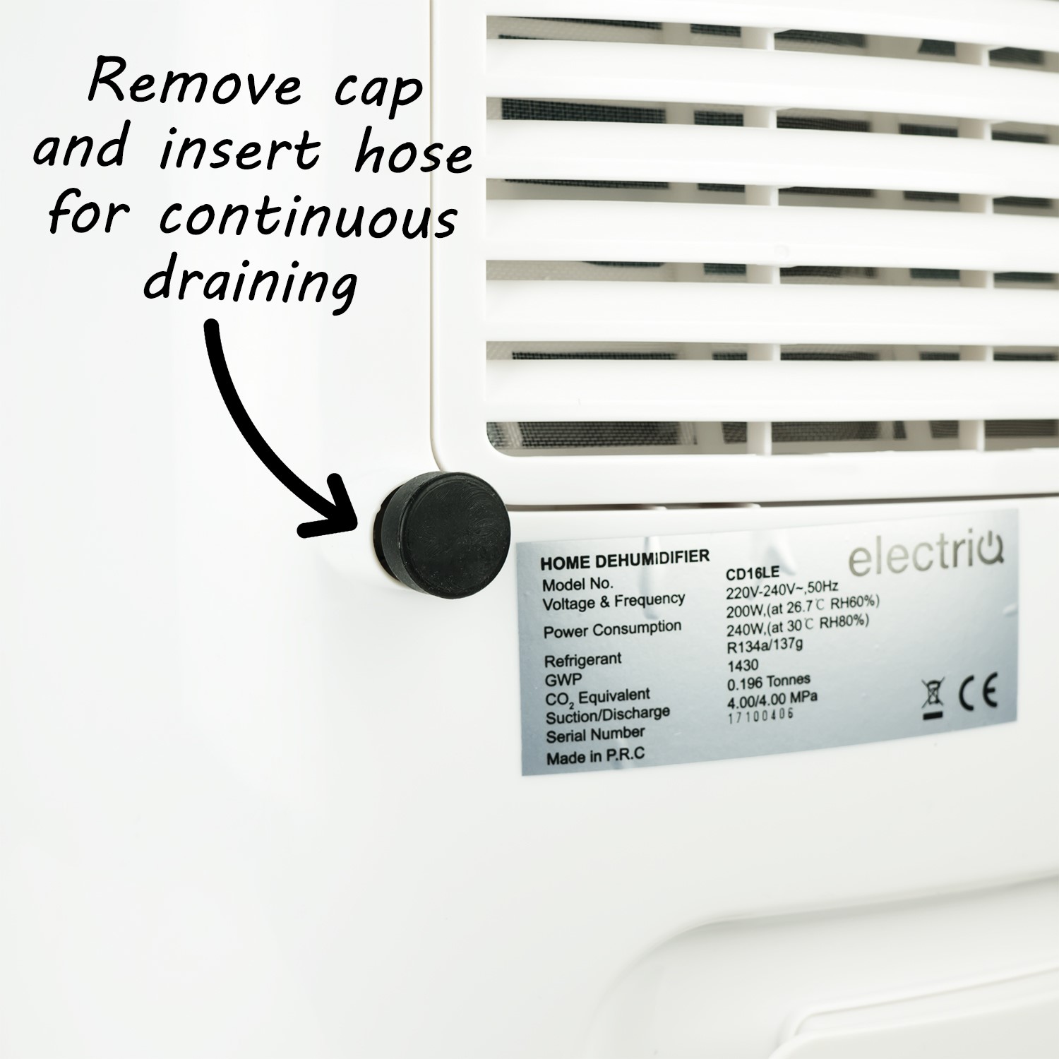 The water tank is large enough to hold up to 4 litres of water and you don't need to worry about it over flowing because the unit will stop once the tank is full. The Intelligent humidistat control logic ensures maximum water extraction with minimum power use. The water tank is cleverly positioned at the front of the dehumidifier for quick and easy access. The CD16LE can also be set up for continuous draining by connecting a hose into the drain outlet at the back.