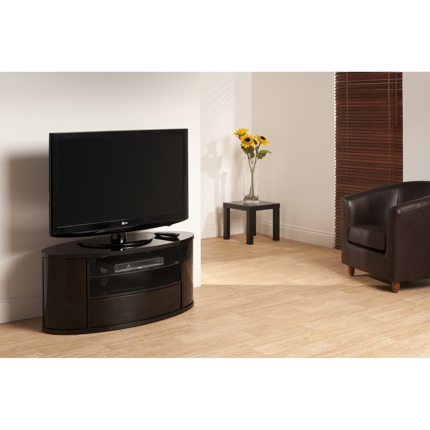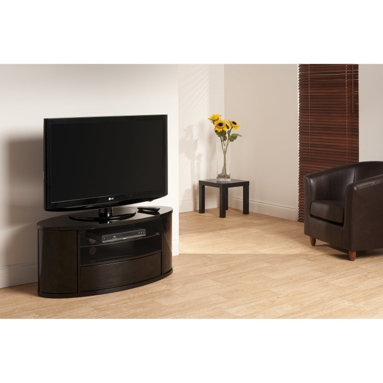 Three shelf elliptical piano black cabinet with curve fronted clear glass shelf, incorporating two end cupboards and a centrally located drawer, all with 'handle less' push to open function. Simple Elegance equally suited to corner or flat to wall placement.