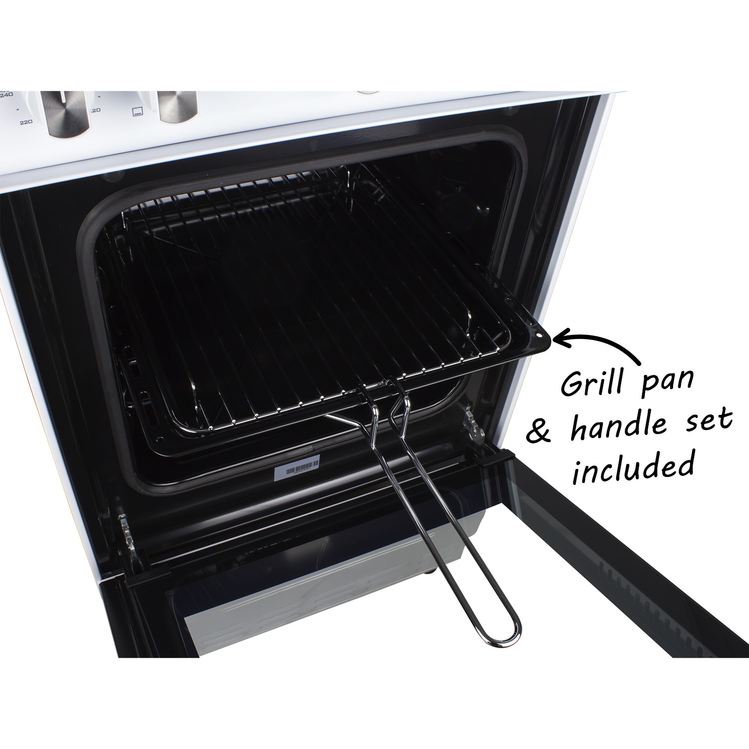 - Includes 1 cooking tray, 2 shelves and grill pan handle set