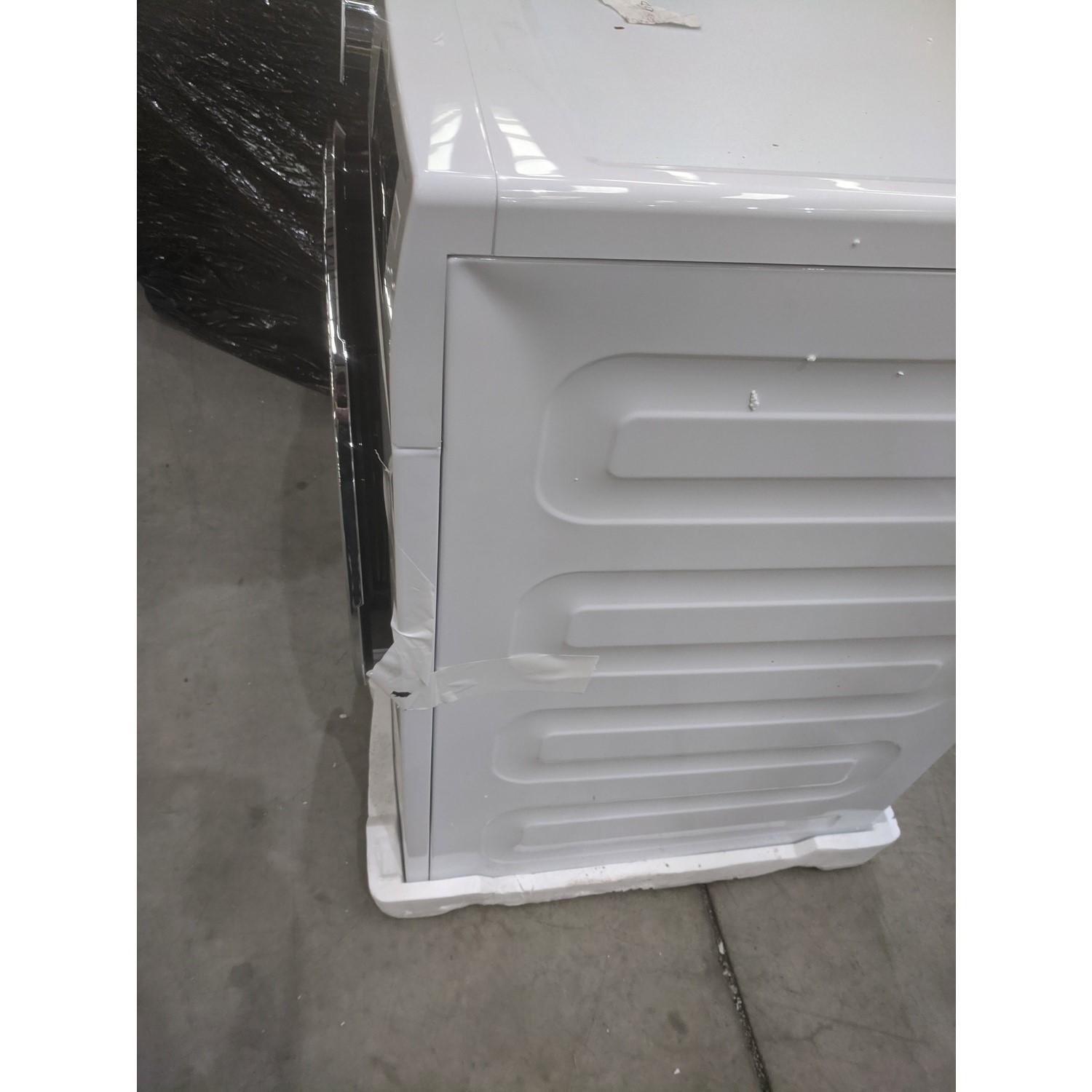 The right hand side panel is dented on the left hand side edge near the top corner of the washing machine.
