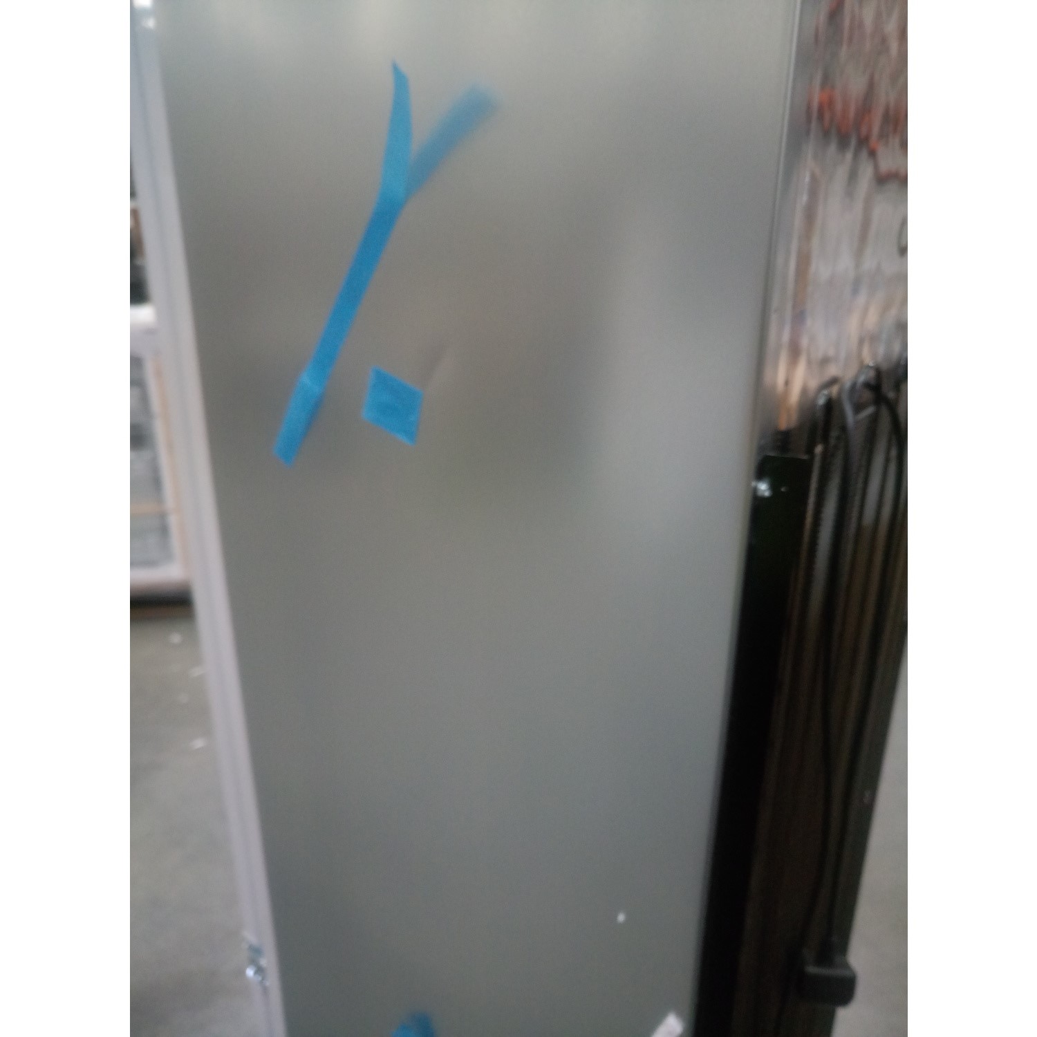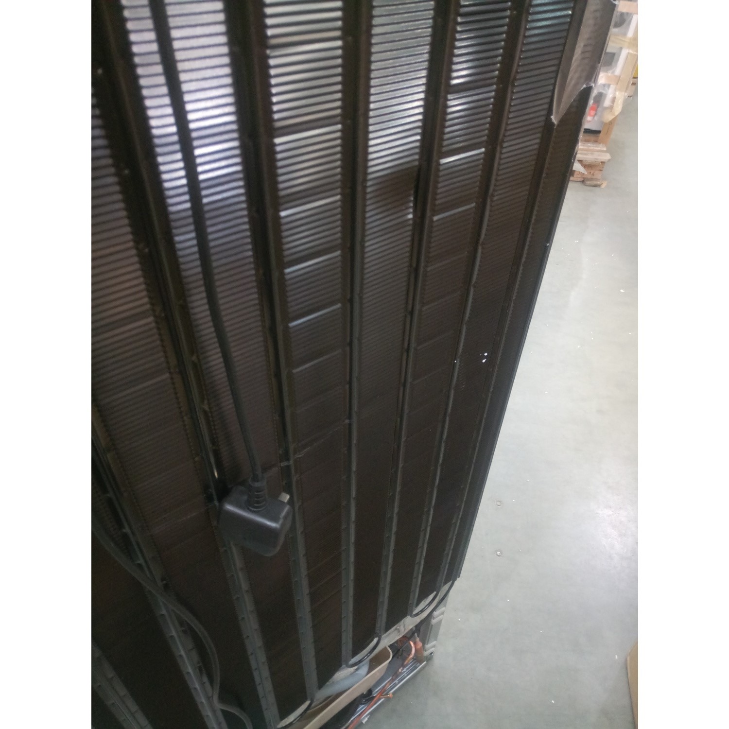 Both doors on the fridge freezer are dented. The cooling panel at the rear of the unit is dented. The left and right-hand side panels are both dented, and the edging strip on the unit is also dented. Please see images.
