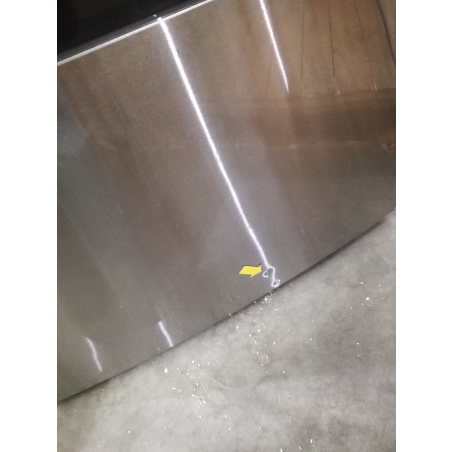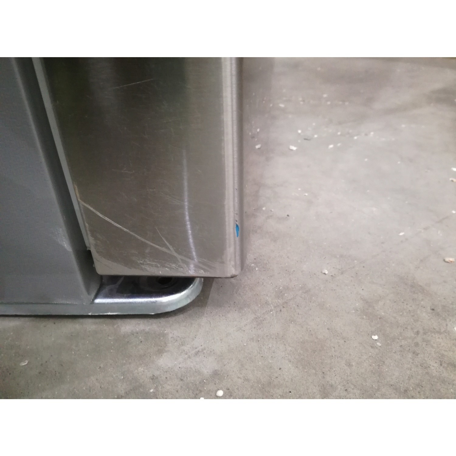 The left and right-hand doors are dented, along with the bottom doors on the fridge freezer. The left-hand side panel towards the rear of the unit is dented and scratched. The right-hand side panel has a large dent and scratch towards the bottom of the unit. All four feet supports are damaged and one is missing. Please see images.