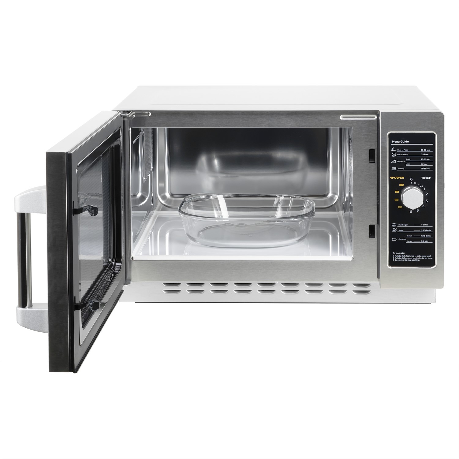 There's a choice of five power levels up to a maximum of 1000 Watts to suit your preference, ranging from a high blast to a low defrost. It's extremely powerful that you'll be able to reheat all kinds of food in under a minute, including slices of pizza, pies, desserts, etc. In fact, the timer only goes up to 6 minutes because that's as long as you'll ever need to reheat any meal. Again, it all makes for quick a turnaround in the kitchen to keep hangry customers at bay.