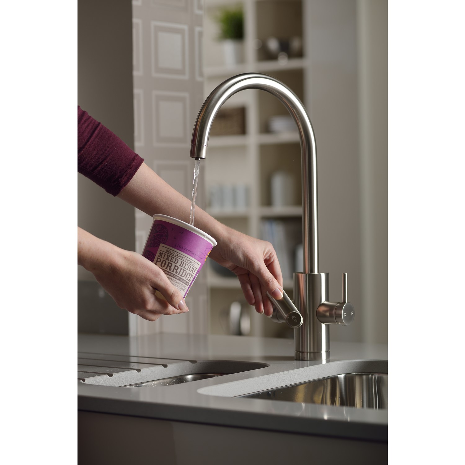 The elegant swan-neck tap features a 360° swivel spout thats ideal for both single or multiple sinks and comes in a range of different finishes to complement any kitchen. For added peace of mind, the tap offers a host of safety features including a a Hotkey mechanism which will activate the boiling water and without the Hotkey the tap reverts to a family safe 3 way mixer tap. Plus, the insulated spout includes an inner pathway for the steaming hot water to pass through, which means the tap always remains cool to the touch.