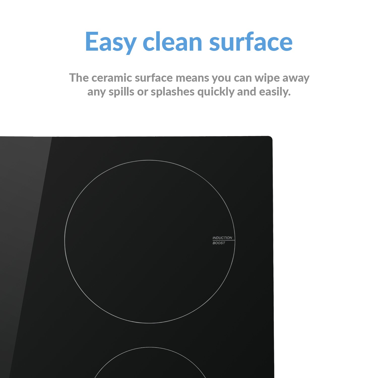 The control panel is conveniently positioned at the front of the hob for quick and easy access to all the cooking functions. It uses touch controls which are really responsive and easy to use, offering nine power levels to cook your meals to perfection. There's even a handy power boost function that can be used to give your cooking zone a speedy hit of extra heat when required, making it ideal for flash frying or bringing a pan to the boil faster. The timer function is great too as it can be programmed to switch off your chosen hob zone after a set amount of time to prevent any overcooking or burning. Or if you prefer, you can also use it as a simple minute minder to alert you when your set time has ended, rather than switching off.