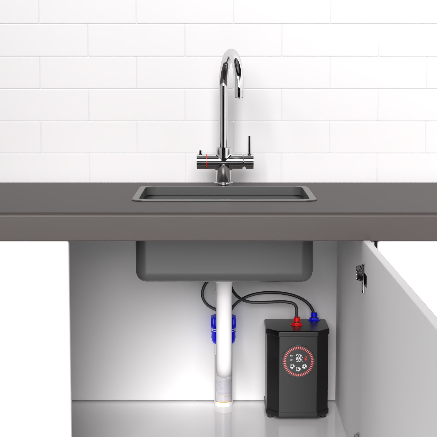 3-in-1 tap provides cold, hot and instant boiling water. The ultimate in kitchen convenience. Improved 1.5Kw performance heats water up quickly after use.