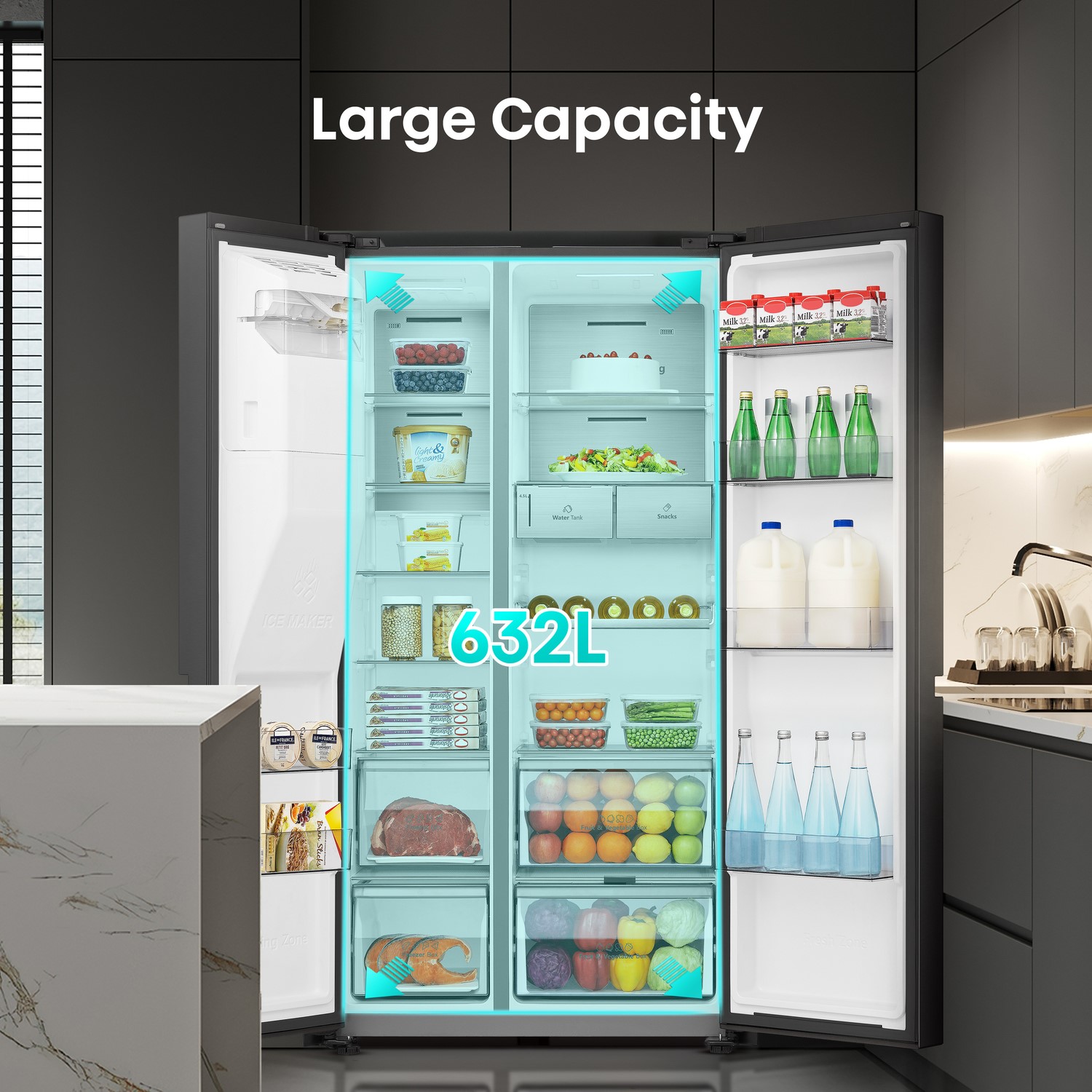 Hisense’s large capacity refrigerators ensure you store any shape, size or type of food, meeting all your weekly shopping needs. Comfortably fit up to 632 litres at once. Its side by side door design will make sure that you can find anything you need at a glance.