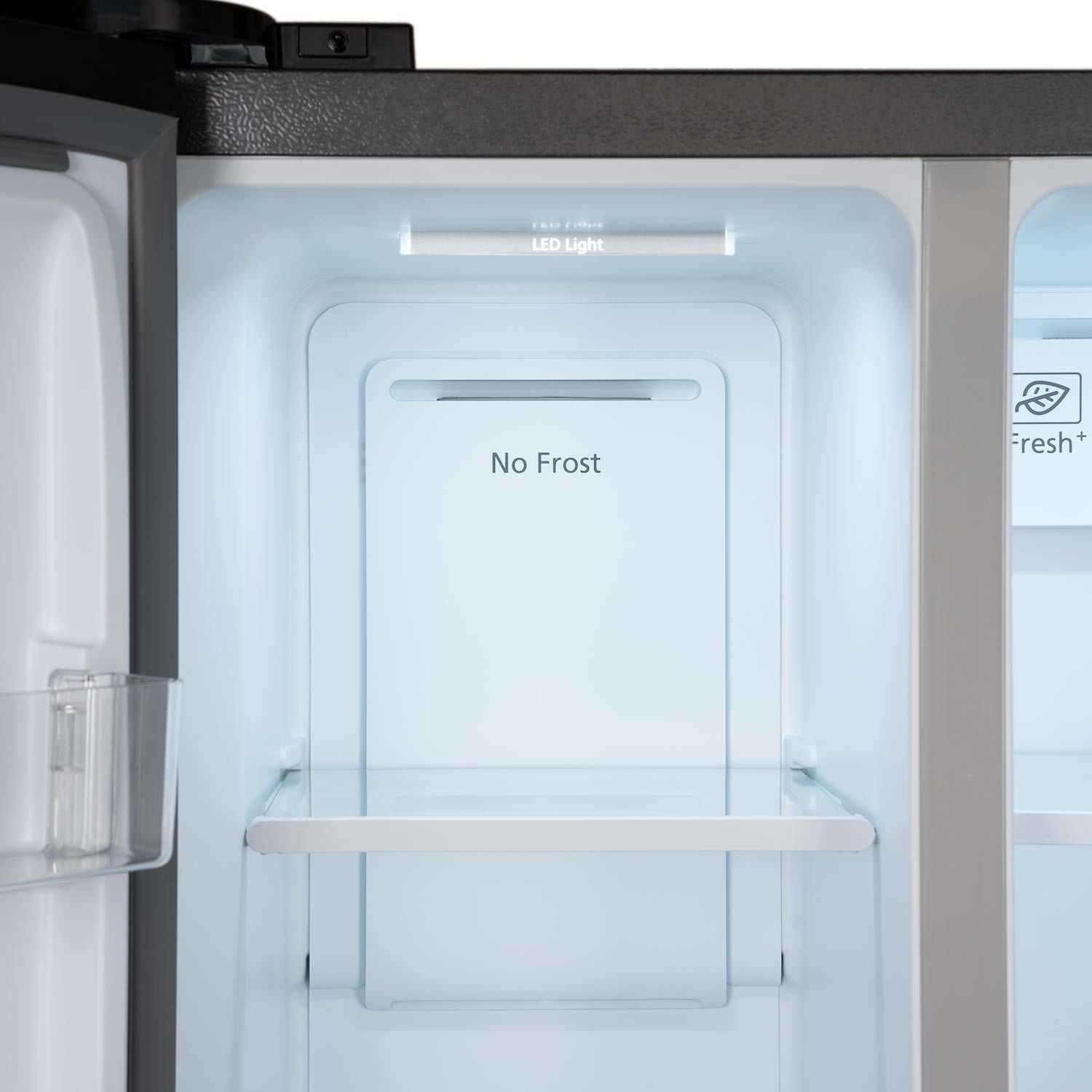 This American style fridge freezer delivers on space and features to help keep your food fresher for longer. The side-by-side design provides a spacious fridge and freezer, perfect for the larger family home. The freezer features Total No Frost technology, which keeps your items fresh, with no need to defrost. In both the fridge & freezer, you’ll enjoy 3 adjustable shelves, so you can fit any item inside, while the fridge section is complete with a salad crisper that keeps your fruit and veg fresh. The internal control panel makes choosing your cooling level quick and easy, while the child lock prevents little fingers making any changes.