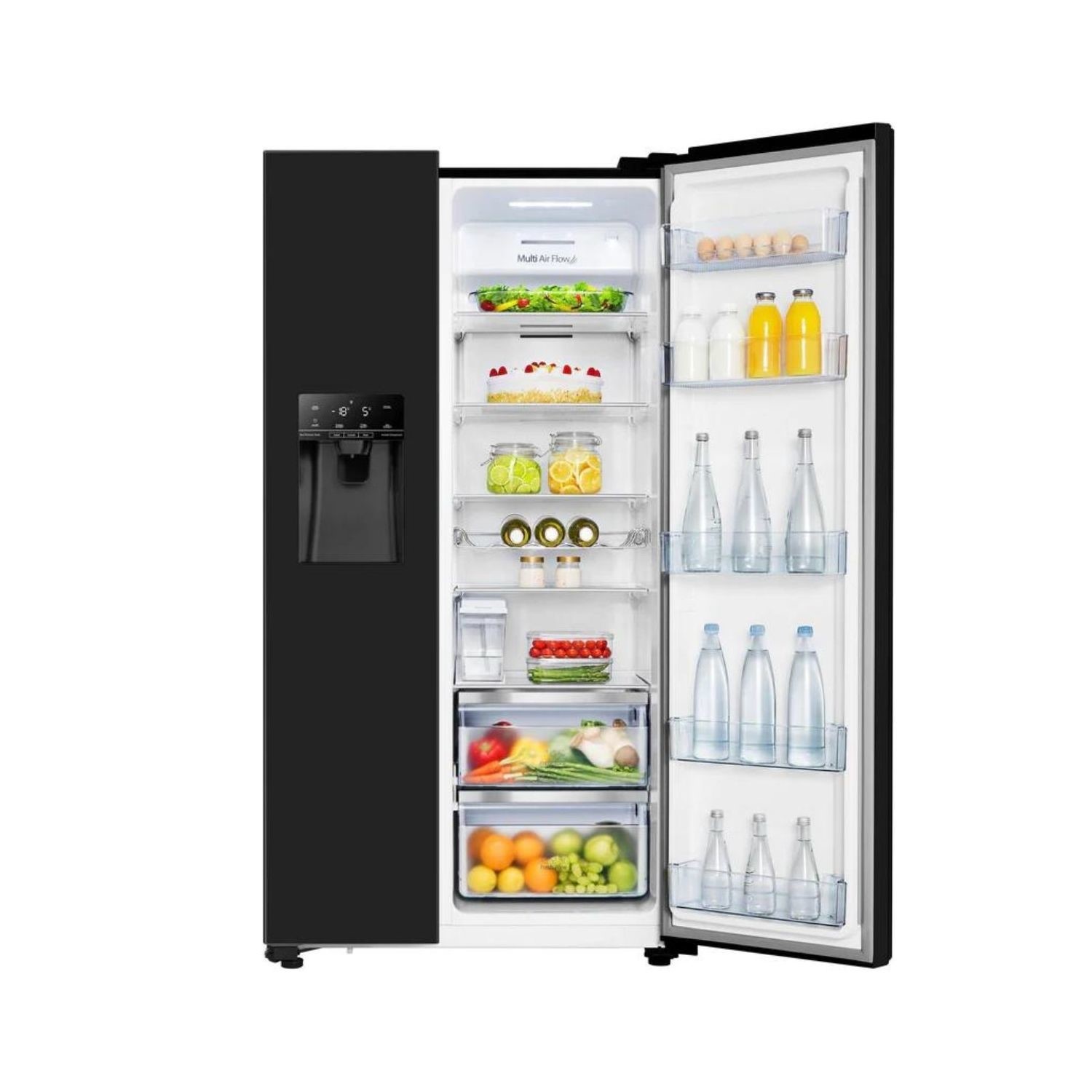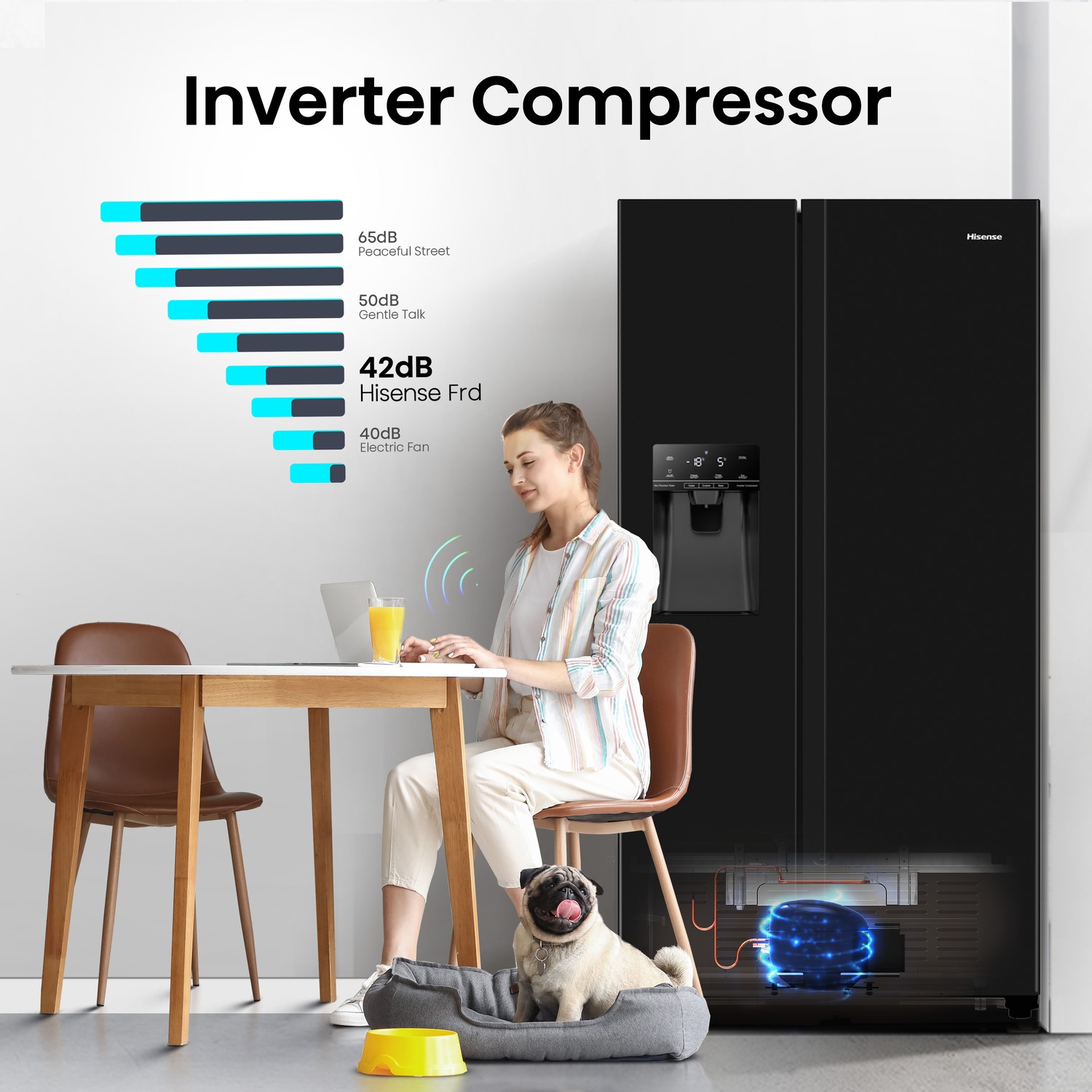 Enjoy plenty of space for stocking up on ingredients with this black American fridge freezer from Hisense. Because it has a large 562 litre capacity, it can hold up to 31 bags of groceries. And it also comes with No Frost technology, circulating cool air inside the appliance to keep ice from forming, which means it doesn't need manual defrosting. There's a non-plumbed water and ice dispenser too, giving you refreshing drinks of H20 on tap - perfect for warmer days. Plus, the digital motor is whisper-quiet and uses less energy, so it's great for your wallet and the environment.