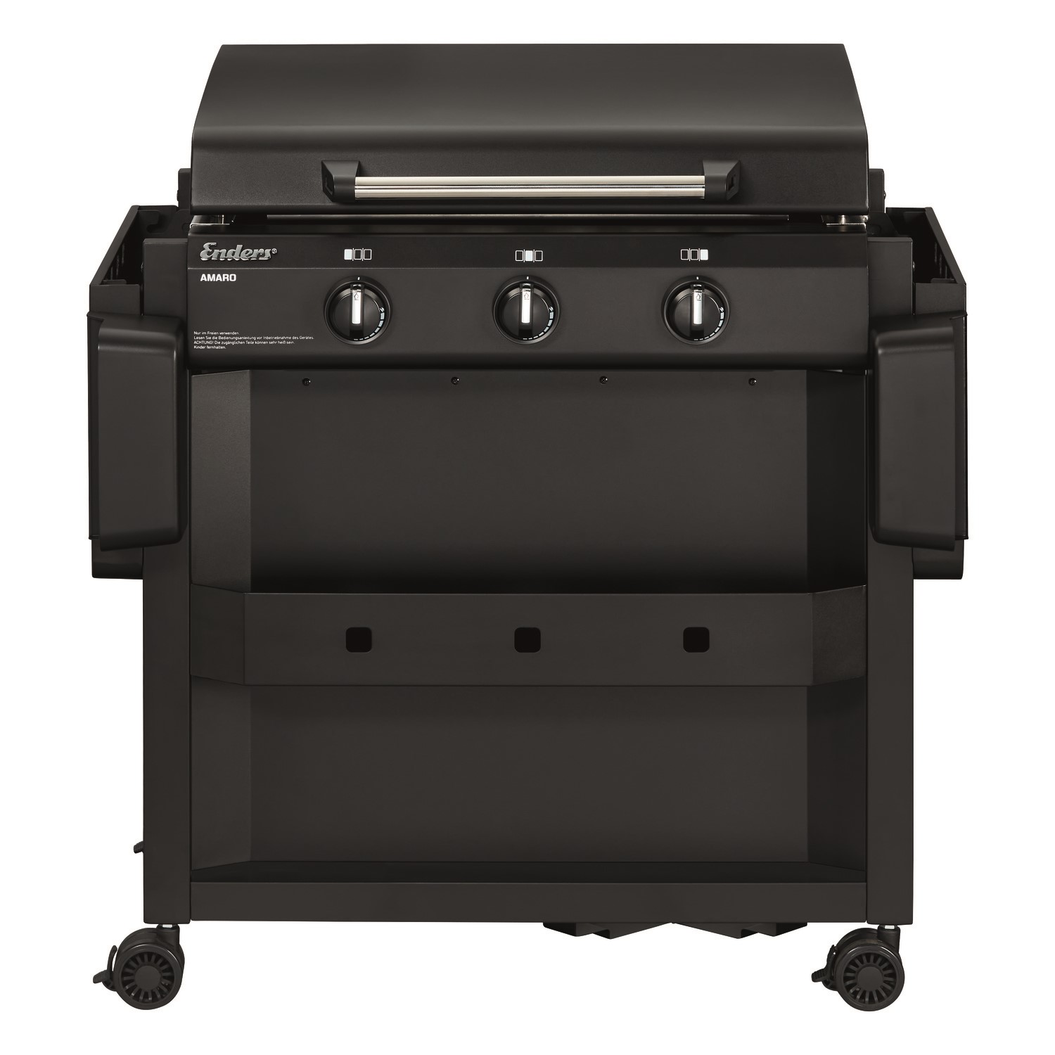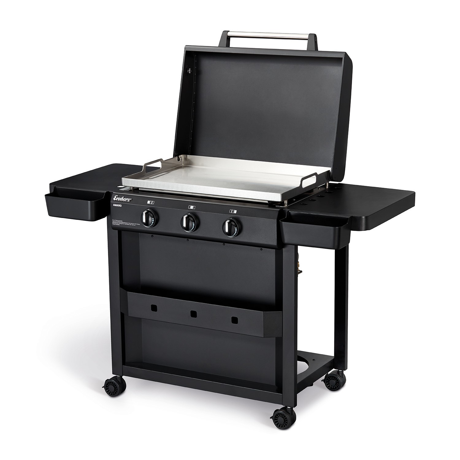 THE NEW FRONTIERS OF BARBECUING PLEASURE With the AMARO™ plancha grill, you can experience the art of grilling in a new way: not on an ordinary grill grate, but on a huge stainless steel plancha! Thanks to their shape, the three infinitely adjustable P-shaped burners made of stainless steel transfer heat directly to the plancha over a large area, bringing it up to temperature quickly - for truly flavourful meals! The removable lid not only protects your plancha from the wind and weather between barbecues, but can also be easily removed without tools - flat matt finish! With the fold-down side tables and practical hooks on which you can hang baskets for spices or barbecue utensils, you have everything you need right at hand. And the generous storage compartment at the front offers even more space for large bottles or your favourite sauces. The AMARO™ celebrates the new way of grilling with practical functions - for those who want even more