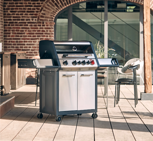 - 4 continuously adjustable stainless steel burners for powerful direct and indirect barbecuing / baking