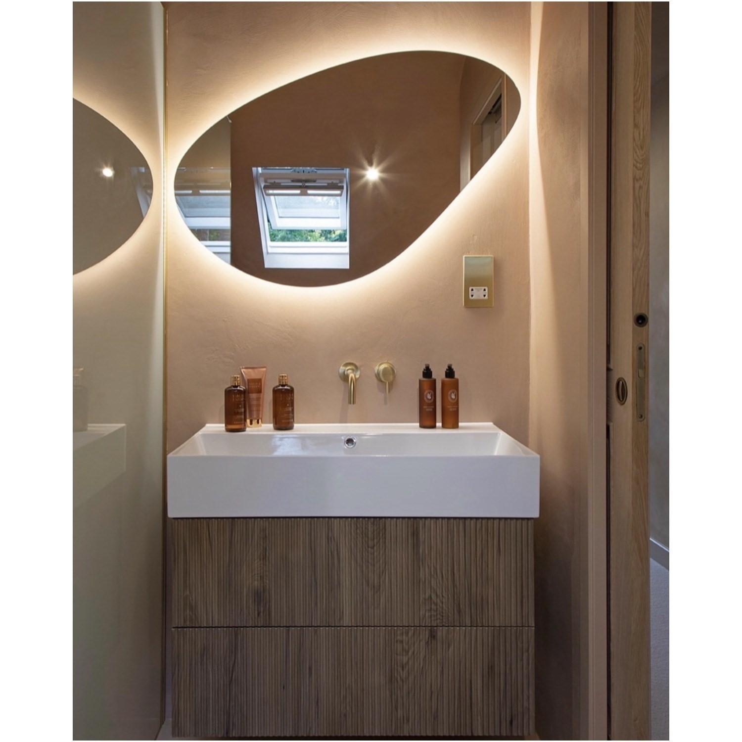 - The back-lit light enhances its organic shape and will add a spa feel to your bathroom