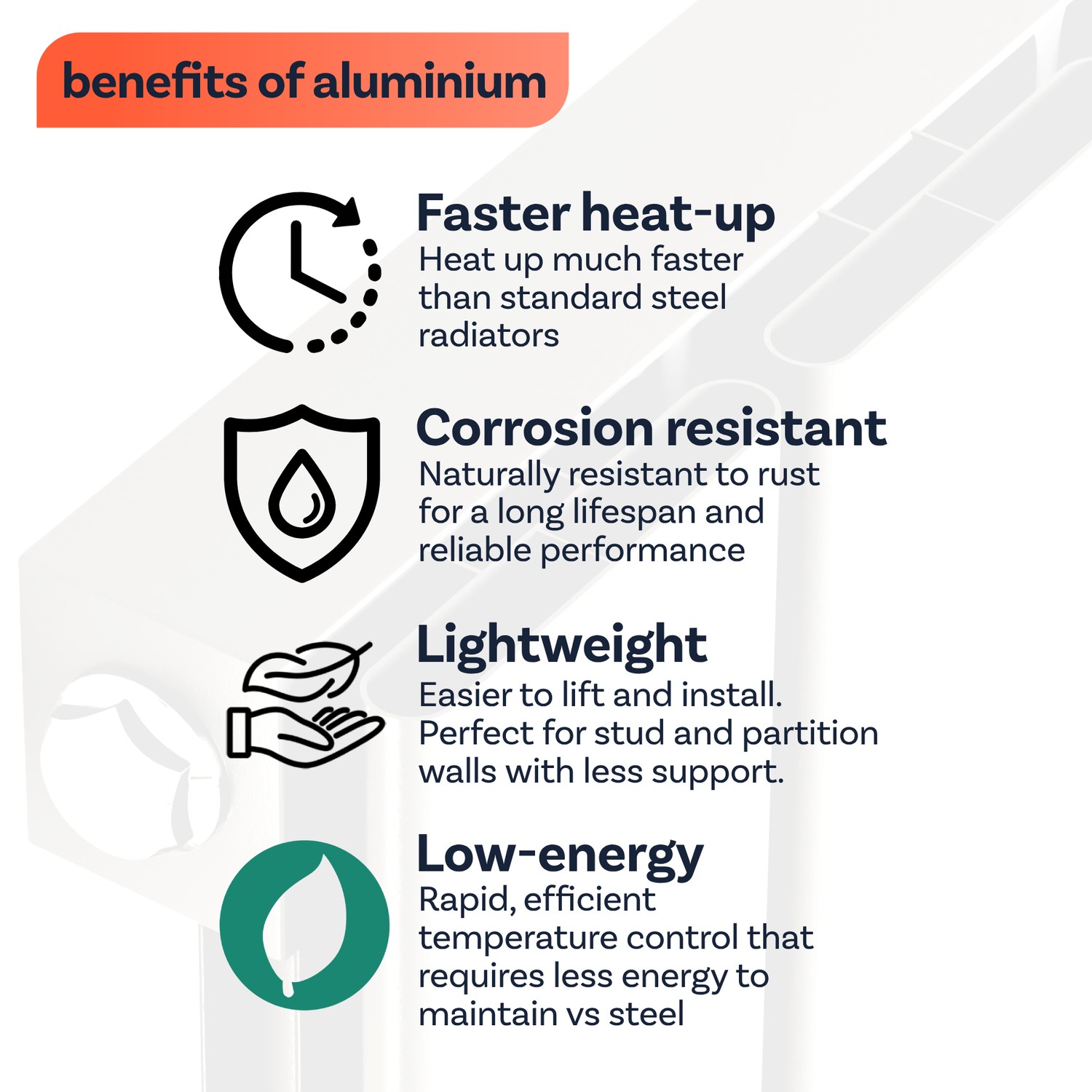 - Lightweight: Aluminium radiators are lighter than steel ones, which makes them ideal for installation on stud and partition walls.