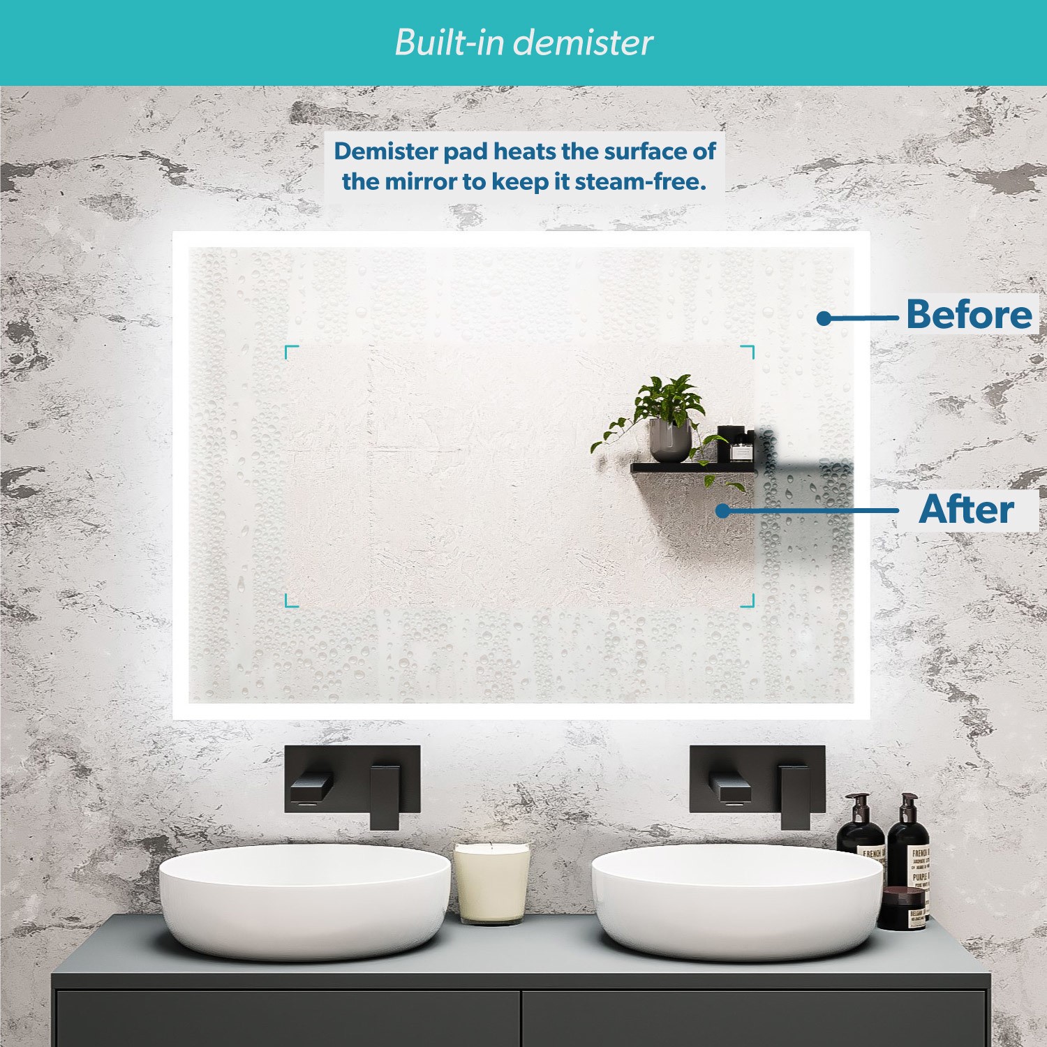 - Heated bathroom mirror with a built-in demister pad