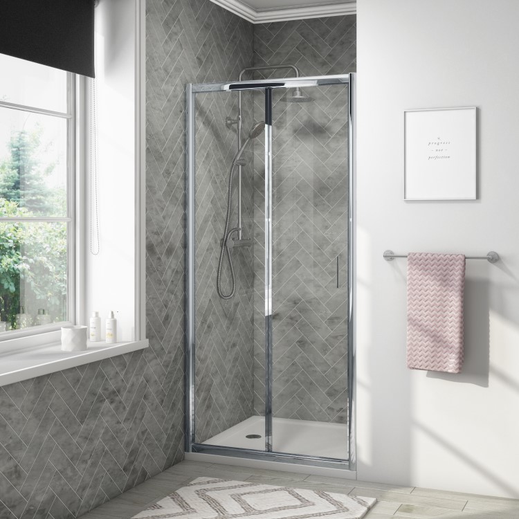 Bi-fold shower door are sleek and elegant, and are perfect for modern bathrooms thanks to the way the doors fold inwards when open, taking up less space, and the height of 1850mm prevents shower spray from reaching the bathroom. Since there are no glass panels, cleaning this shower door is easier and all fittings are included for a quick and simple installation.