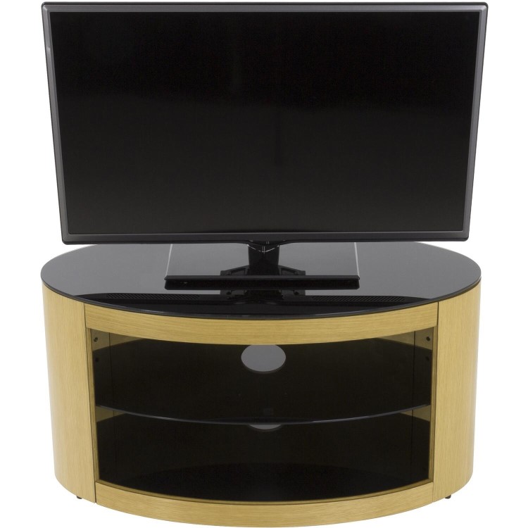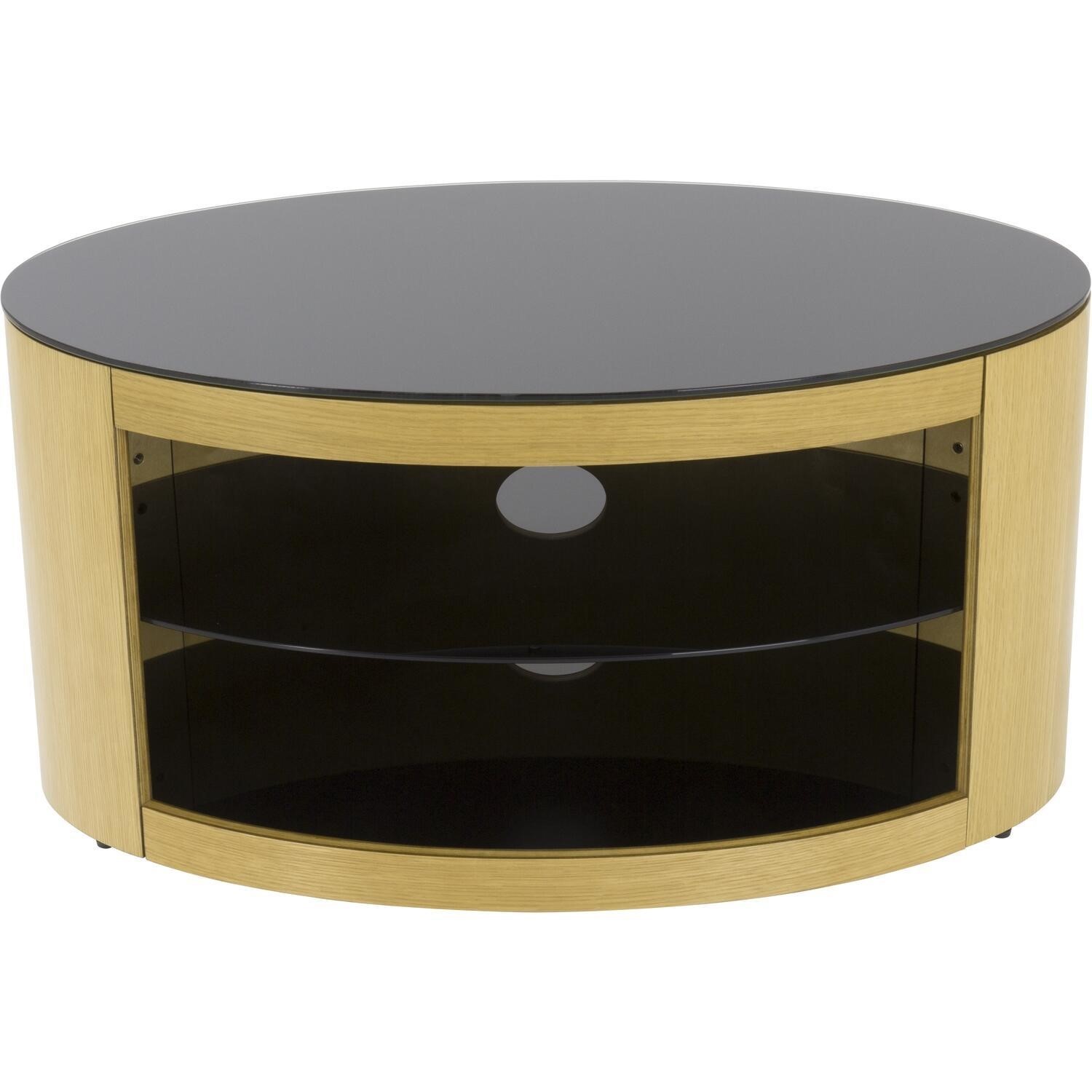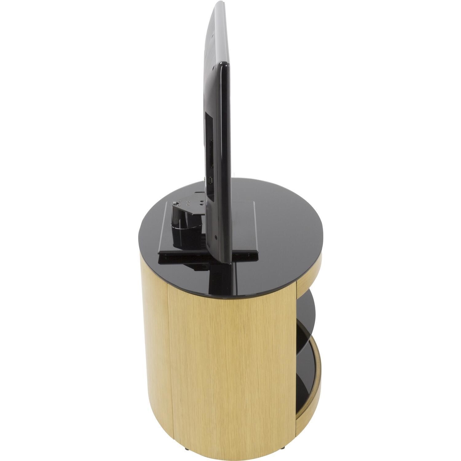 The Buckingham Series is a real wood veneer TV stand based on a timeless oval shape, with an open shelf design. Dressed in a wood veneer finish and black glass, it features a full width back panel and is perfect for positioning in the corner or flat against the wall. Cable management is also provided to route TV and accessory cables.