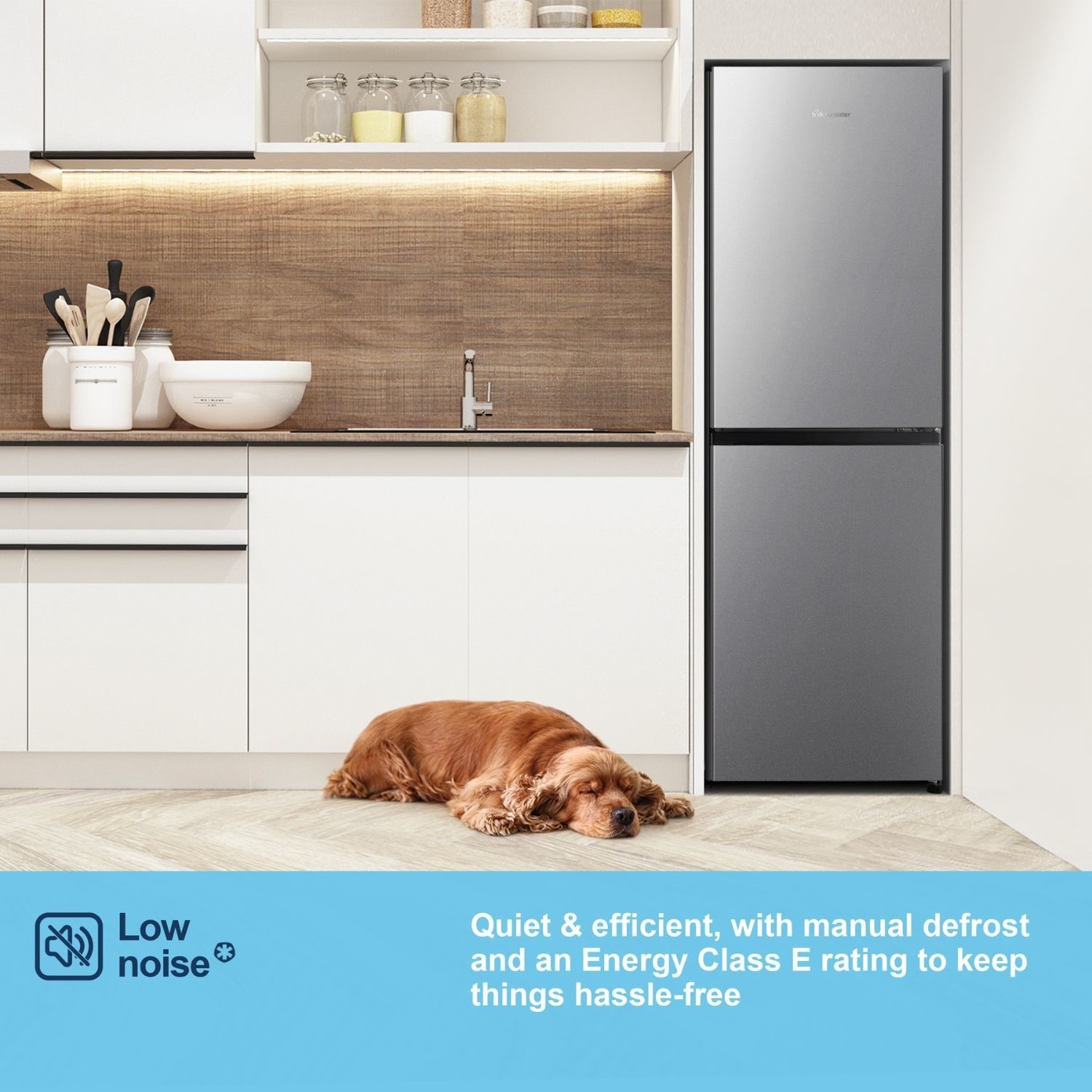 Meet the Fridgemaster MC55240ES, a sleek 50/50 fridge freezer in silver finish, standing at 174 cm tall — perfect for modern UK kitchens. It offers ample storage, with a total capacity of 252 litres (158 L fridge / 94 L freezer), and practical features like a full-width crisper drawer, 3 freezer compartments, and a noiseless performance at just 39 dB. With an E energy rating, touch controls inside, and an inverter compressor for efficiency, it balances style and utility. Designed for flexibility, it includes adjustable feet, a reversible door, and a “fresh zone” to help keep produce crisp.