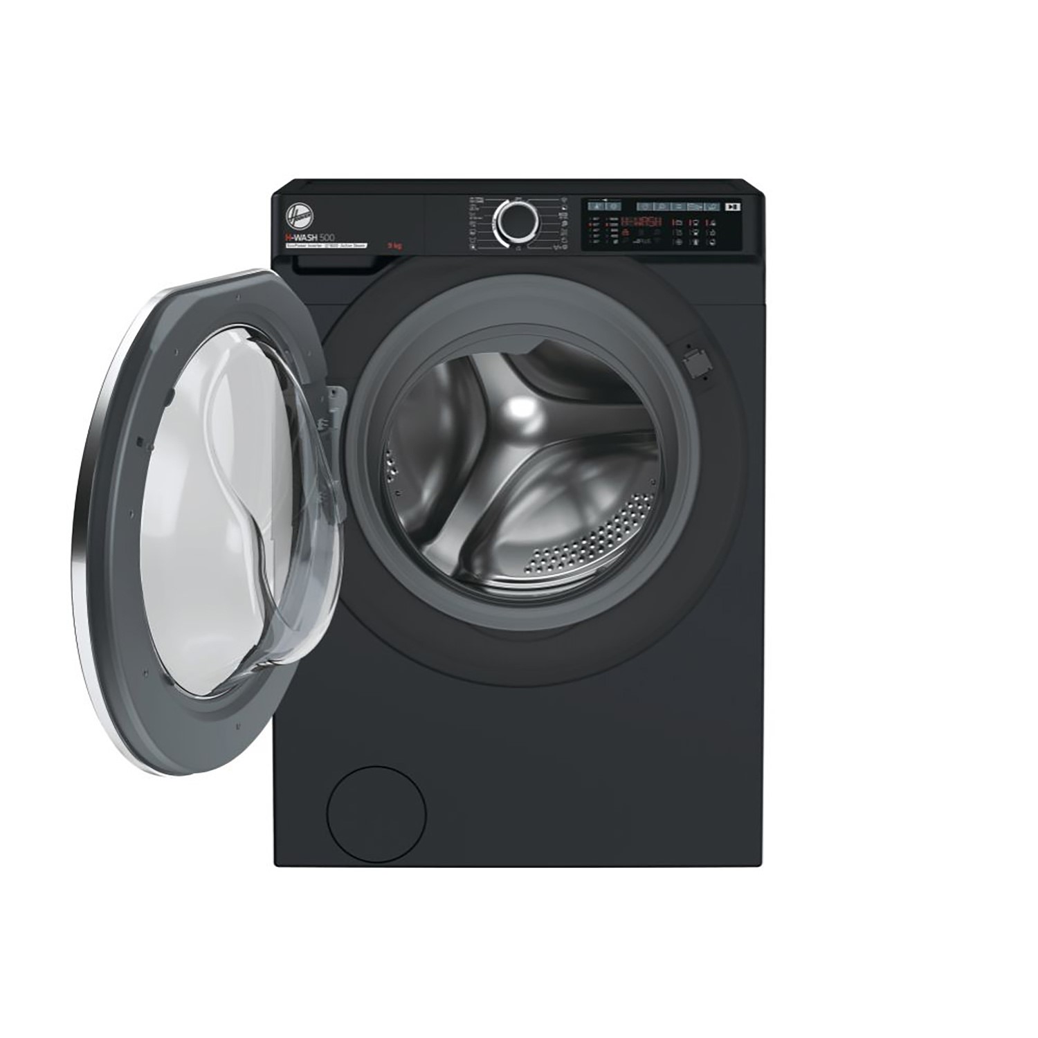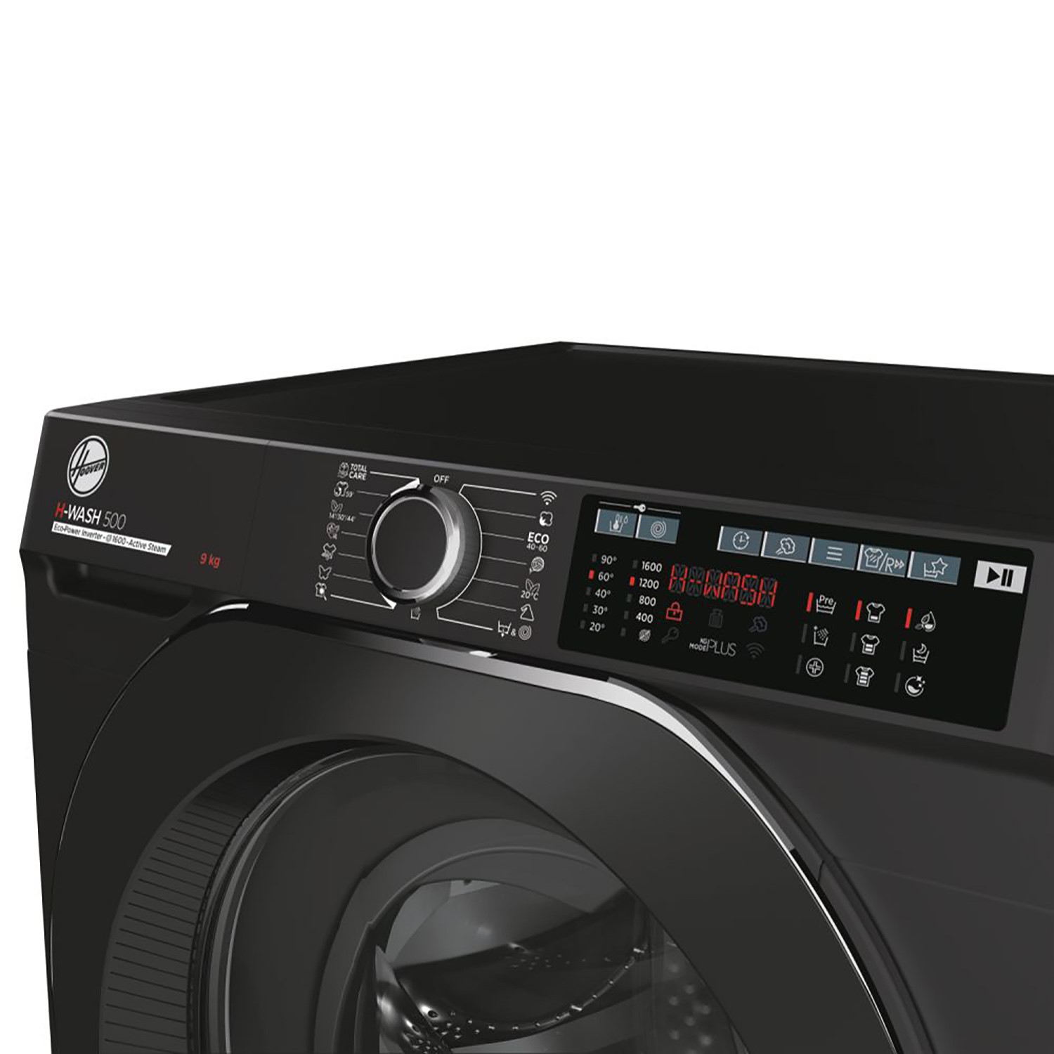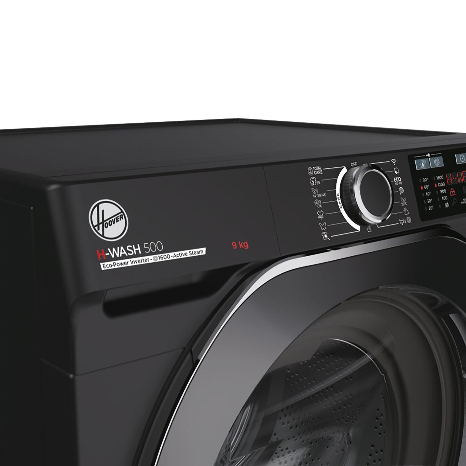 This Hoover washing machine from the H-Wash 500 range comes with a 9kg capacity, a 1600 spin speed, and an A energy rating. . There are 16 wash cycles to choose from, including 4 cycles below 60 minutes, and the All in One cycle, which allows you to wash a full load in under an hour. This machine also comes with the option to delay the cycle start time for up to 24 hours. Variable spin and temperature settings allow you to adjust the spin speed and temperature on all cycles to suit he load. Fitted with WiFi technology, you can connect your smartphone to the machine via the app, giving you the ability to download additional programmes and run diagnostic checks on your machine.