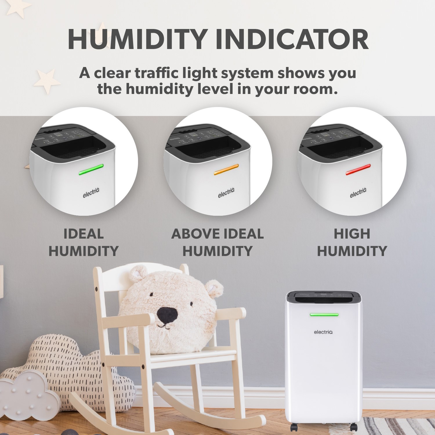 With simple touch controls and a clear LED display, it's easy to set to your desired humidity. A traffic light system delivers a clear indication of the humidity level in your room by showing red for high, amber for comfortable and green for low or dry.