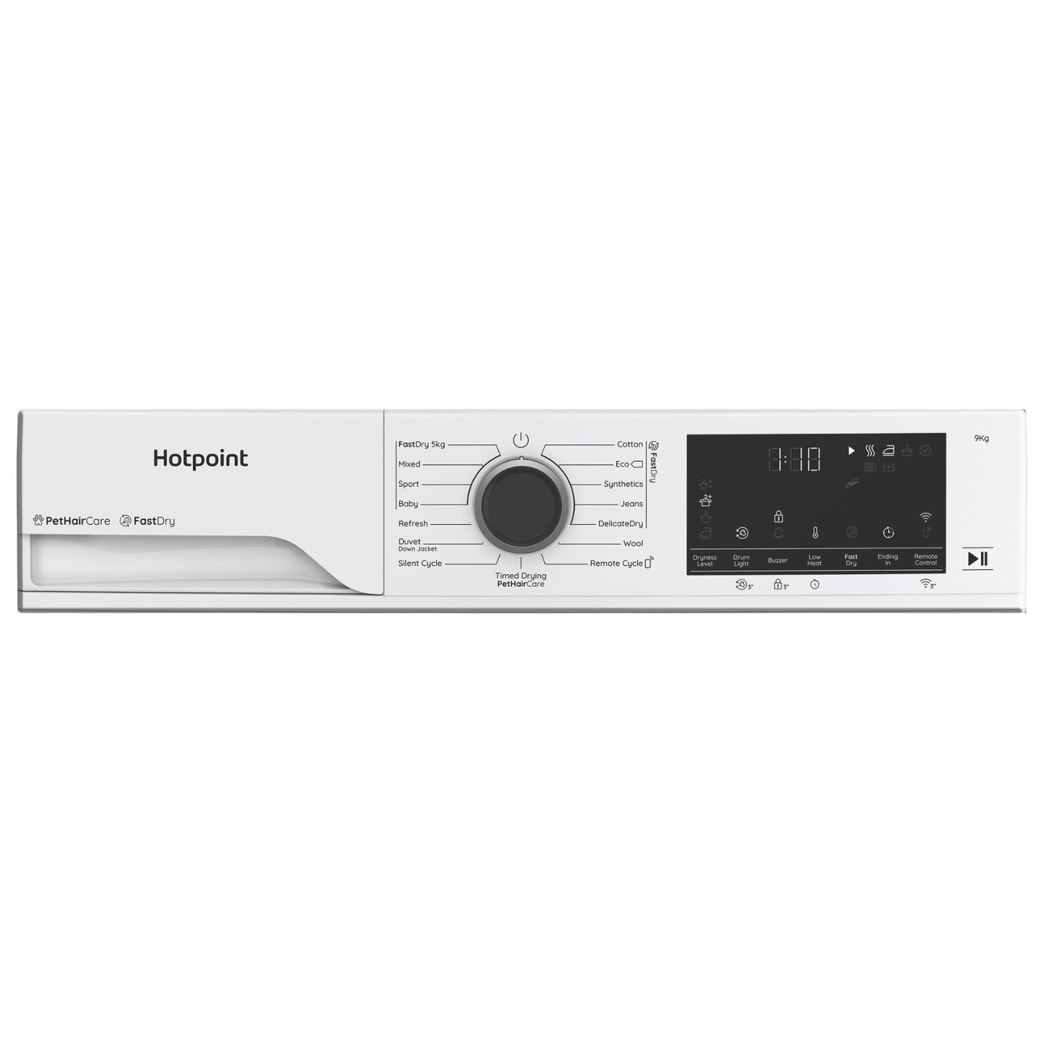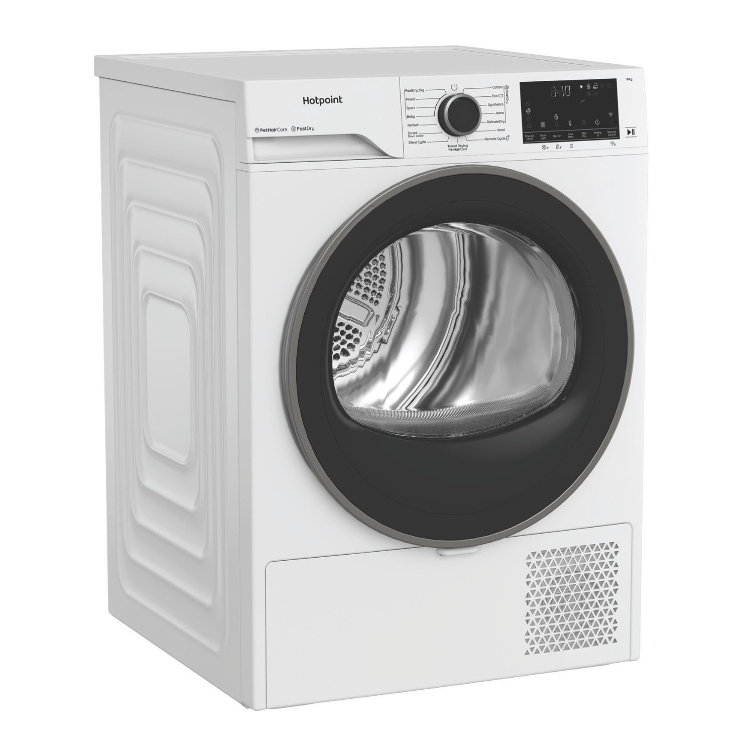 Meet the Hotpoint Fabric Care C HD 94M WBS UK 9kg Heat Pump Tumble Dryer. This A+++ rated dryer uses clever Heat Pump technology to save you money on your energy bills, making it a smart choice for your home. With its large 9kg drum, it handles family-sized loads with ease. If you have furry friends, the special PetHairCare cycle uses steam to gently lift and trap fur, leaving your clothes clean and fresh. Plus, with Smart Wi-Fi, you can control your laundry from anywhere using your phone, making life even simpler.