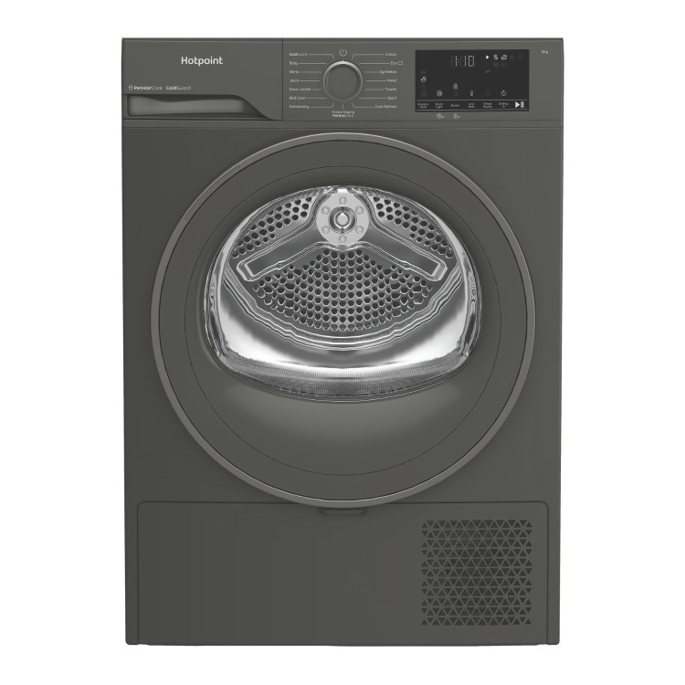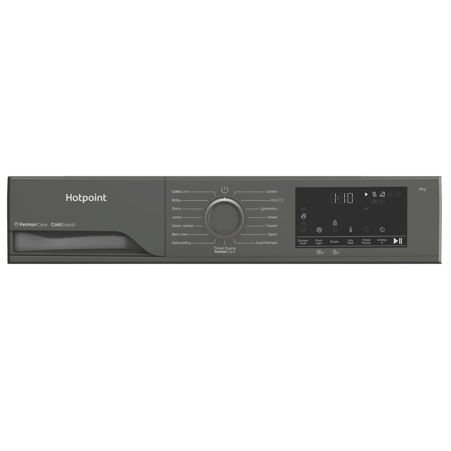 Meet the Hotpoint C HSD 82M BB UK 8kg Heat Pump Dryer in a modern graphite finish. This A+ rated dryer uses clever Heat Pump technology to save you money on your energy bills, making it a smart choice for your home. With its large 9kg drum, it handles family-sized loads with ease. If you have furry friends, the special PetHairCare cycle uses steam to gently lift and trap fur, leaving your clothes clean and fresh.