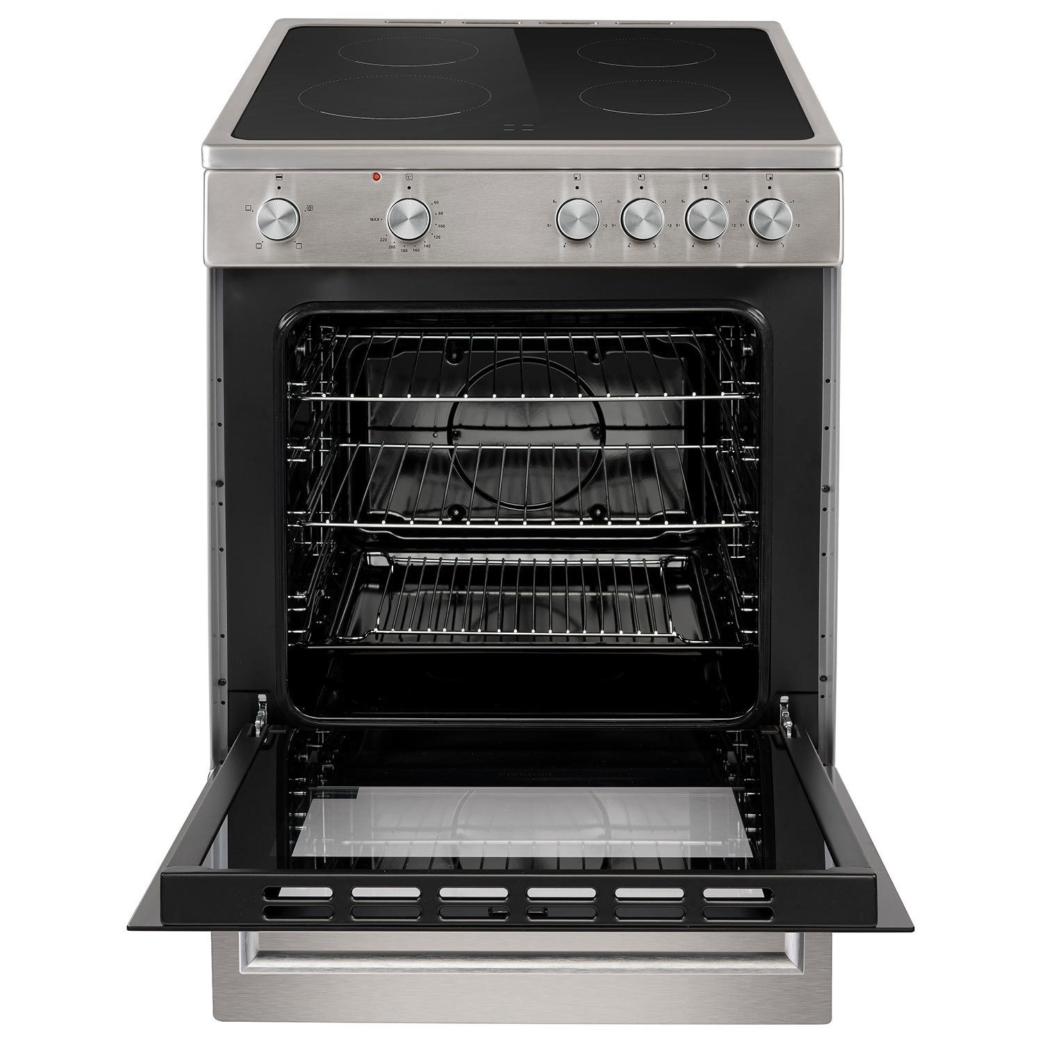 This stylish cooker is perfect for handling all your cooking needs with ease. It boasts a 68-litre capacity that's ideal for cooking larger meals. The oven also serves as a grill, for quick bites or to add those final touches to your dishes. At the top, you’ll find a sleek four-zone ceramic hob that’s quick to heat up and super easy to keep clean – just wipe away spills with a cloth. Plus, you'll love how easy it is to control everything with the rotary knobs, for quick and hassle-free cooking.