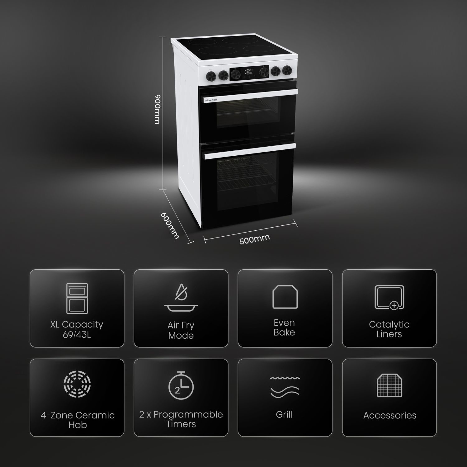 Leading the way in XL capacity, the Hisense Hi6 Max freestanding cooker is versatile, convenient and packed with functions and accessories to enhance your cooking experience. Featuring a spacious 43-litre multifunctional top cavity and a generous 69-litre compartment for additional cooking and air frying, you'll be soon whipping up a feast for family gatherings or simply meal prepping for the week ahead.