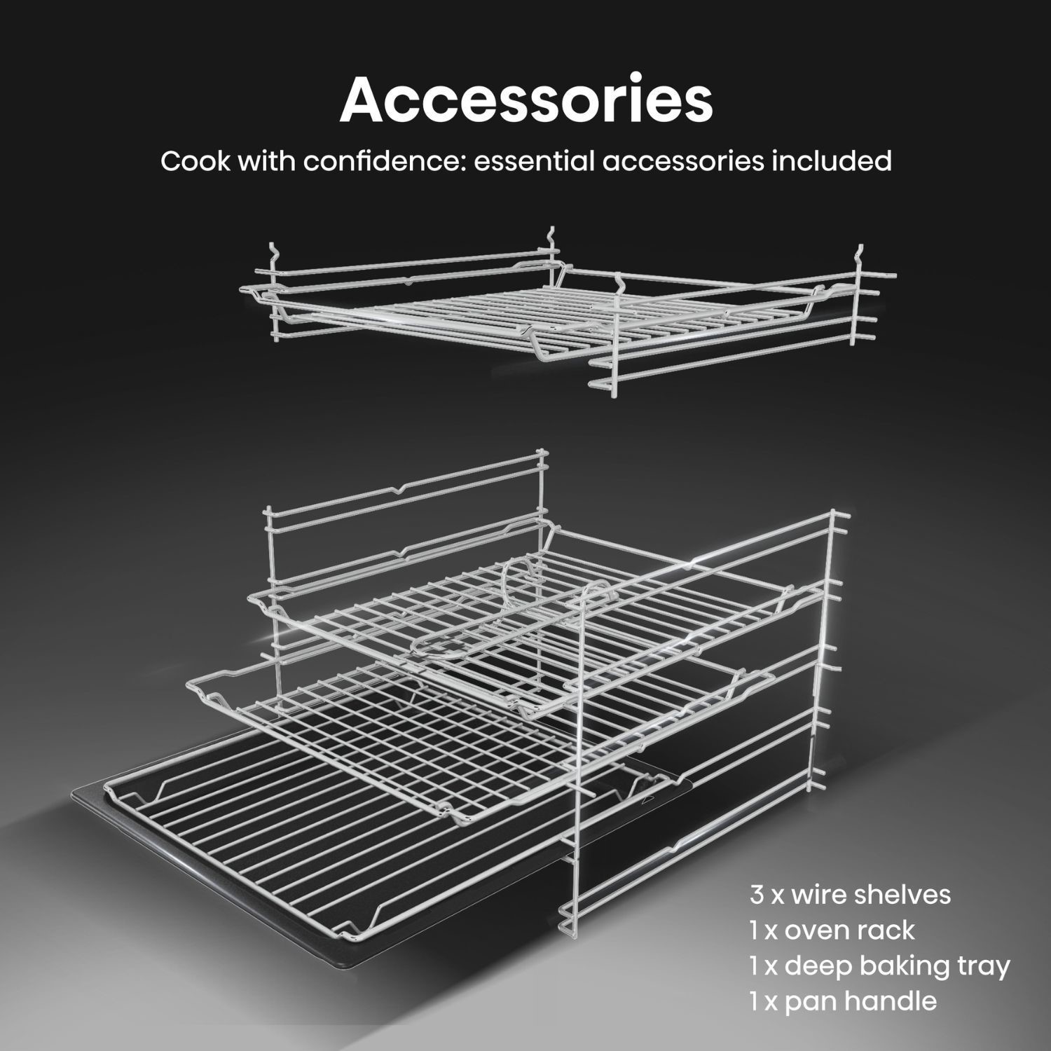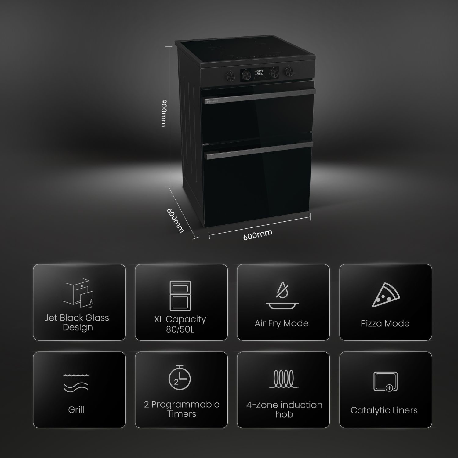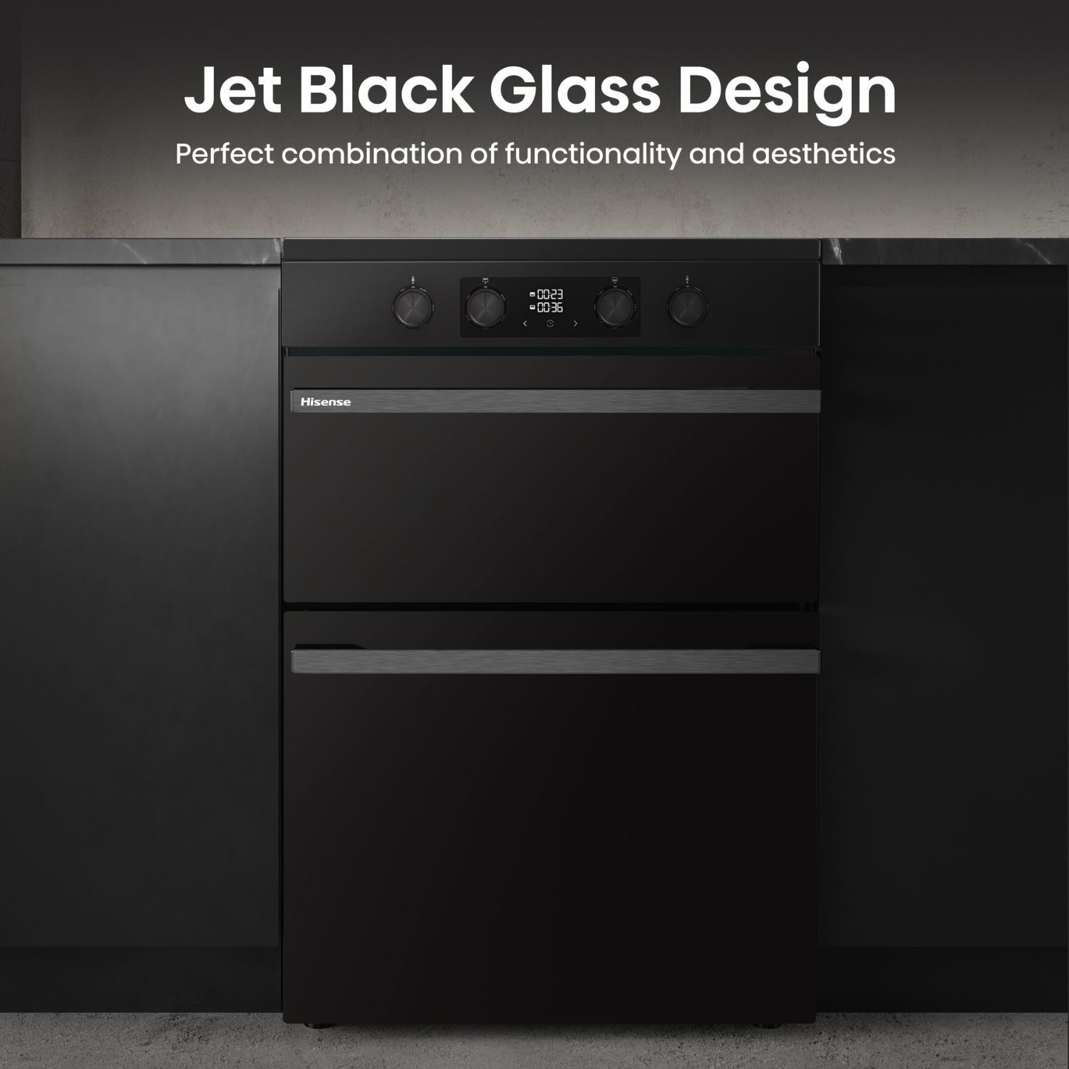 Introducing our premium freestanding cooker range, where innovation meets elegance. Leading the way in XL capacity, designed to cater to your largest gatherings with ease. Admire the sleek jet black glass design that adds a touch of sophistication to any kitchen. Embrace versatility, with the included air fry mode, perfect for achieving crispy perfection, without the need to purchase an additional appliance. And don't forget about our specialised pizza mode, ensuring your homemade pizzas emerge just as delicious as those from your favourite Italian pizzeria. Revel in the convenience of dual programmable timers, allowing you to manage multiple dishes simultaneously, ensuring each one is timed to perfection. Experience speedy and precise cooking control with the 4-zone induction hob, allowing you to effortlessly master every recipe. Plus, enjoy the convenience of included accessories, ensuring you have everything you need to unleash your culinary creativity. When it's time to give your oven a little TLC, say goodbye to tedious cleaning with the convenience of catalytic liners for easy maintenance. Welcome to a new standard of cooking excellence with the Hisense Hi6 Max Freestanding Cooker.
