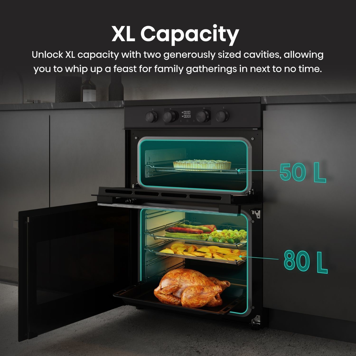 Leading the way in XL capacity, the Hisense Hi6 Max freestanding cooker is versatile, convenient and packed with functions and accessories to enhance your cooking experience. Featuring a spacious 50-litre multifunctional top cavity and generous 80-litre compartment for additional cooking and air frying, you'll be soon whipping up a feast for family gatherings or simply meal prepping for the week ahead.