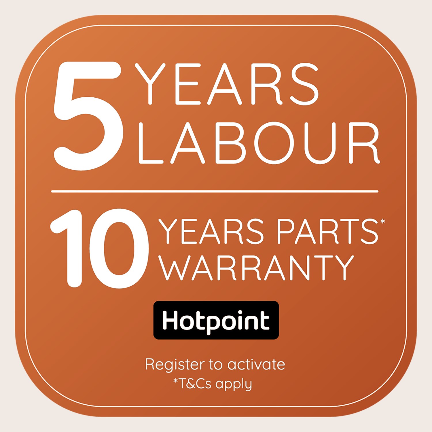 This Hotpoint washing machine really looks after your clothes. Special Fabric Care technology treats garments gently, helping them last longer. For pet owners, the PetHairCare cycle easily removes fur. The Anti-Stain cycle tackles everyday messes like wine or grass without you needing to pre-treat them. And for those busy days, the Full load 45' cycle washes a whole 10kg load in just 45 minutes, perfect when you need clothes clean fast. Need a quick refresh? SteamCare and Steam Refresh options get clothes fresh in minutes, reducing creases and saving you ironing time. With a reliable motor built to last 25 years, this Hotpoint washing machine is a confident choice for an easier home life.