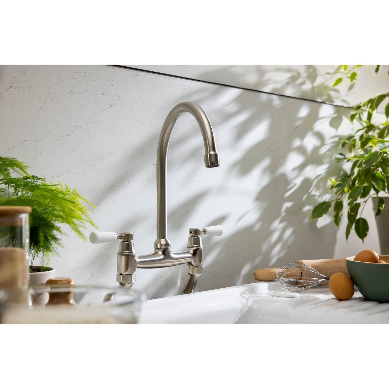 The Abode Traditional Bridge Dual Lever Mixer Tap in Brushed Nickel blends timeless elegance with superior craftsmanship. Its ceramic-style handles and traditional hot and cold indices bring classic character to any kitchen, while durable materials ensure lasting performance across all pressure systems.