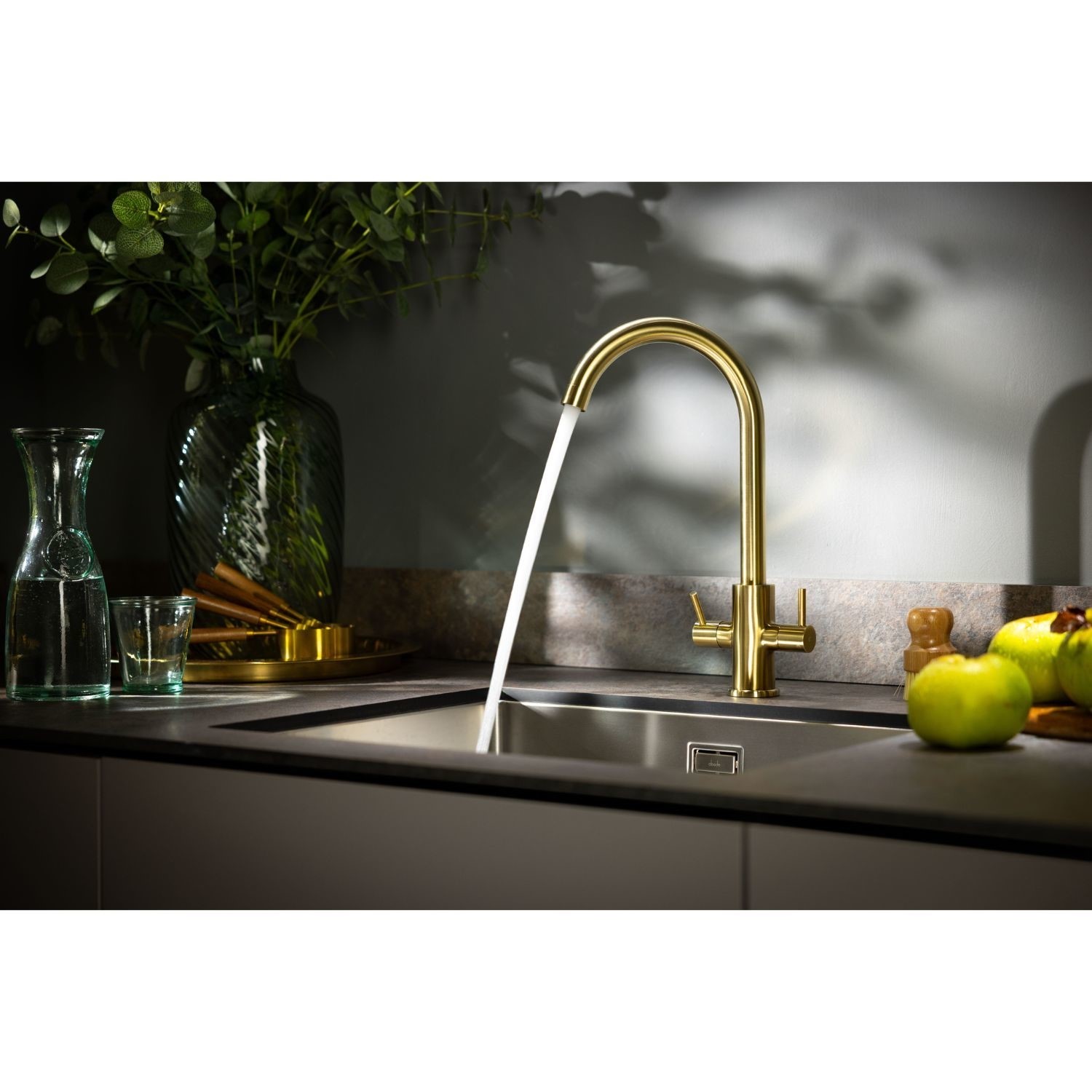 The Abode Marido Dual Lever Mixer Tap in Brushed Brass delivers contemporary elegance with a timeless feel. Designed with a sculptural swan neck spout and smooth dual lever control, it's ideal for modern kitchens looking to make a subtle statement. The brushed brass finish and brass construction ensure both style and durability, while the ceramic disc valves offer reliable performance even at lower pressures.